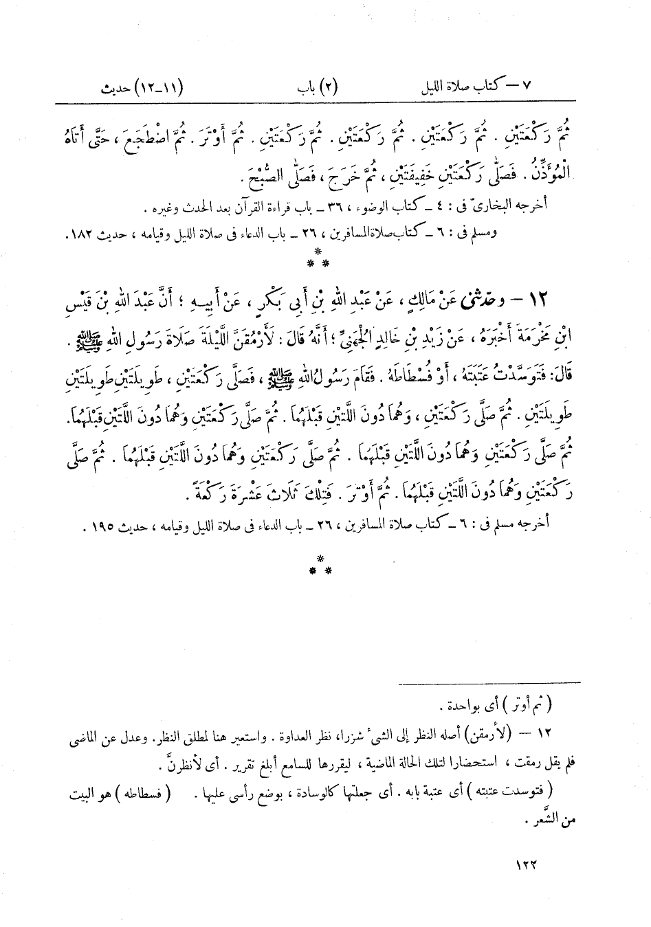 ١٢ - وَحَدَّثَنِي عَنْ مَالِكٍ، عَنْ عَبْدِ اللَّهِ بْنِ أَبِي بَكْرٍ، عَنْ أَبِيهِ أَنَّ عَبْدَ اللَّهِ بْنَ قَيْسِ بْنِ مَخْرَمَةَ أَخْبَرَهُ، عَنْ زَيْدِ بْنِ خَالِدٍ الْجُهَنِيِّ أَنَّهُ قَالَ: لَأَرْمُقَنَّ اللَّيْلَةَ صَلَاةَ رَسُولِ اللَّهِ صَلَّى اللهُ عَلَيْهِ وَسَلَّمَ. قَالَ: فَتَوَسَّدْتُ عَتَبَتَهُ، أَوْ فُسْطَاطَهُ، فَقَامَ رَسُولُ اللَّهِ صَلَّى اللهُ عَلَيْهِ وَسَلَّمَ، «فَصَلَّى رَكْعَتَيْنِ طَوِيلَتَيْنِ طَوِيلَتَيْنِ طَوِيلَتَيْنِ، ثُمَّ صَلَّى رَكْعَتَيْنِ، وَهُمَا دُونَ اللَّتَيْنِ قَبْلَهُمَا، ثُمَّ صَلَّى رَكْعَتَيْنِ، وَهُمَا دُونَ اللَّتَيْنِ قَبْلَهُمَا، ثُمَّ صَلَّى رَكْعَتَيْنِ، وَهُمَا دُونَ اللَّتَيْنِ قَبْلَهُمَا، ثُمَّ صَلَّى رَكْعَتَيْنِ، وَهُمَا دُونَ اللَّتَيْنِ قَبْلَهُمَا، ثُمَّ صَلَّى رَكْعَتَيْنِ، وَهُمَا دُونَ اللَّتَيْنِ قَبْلَهُمَا، ثُمَّ أَوْتَرَ فَتِلْكَ ثَلَاثَ عَشْرَةَ رَكْعَةً»