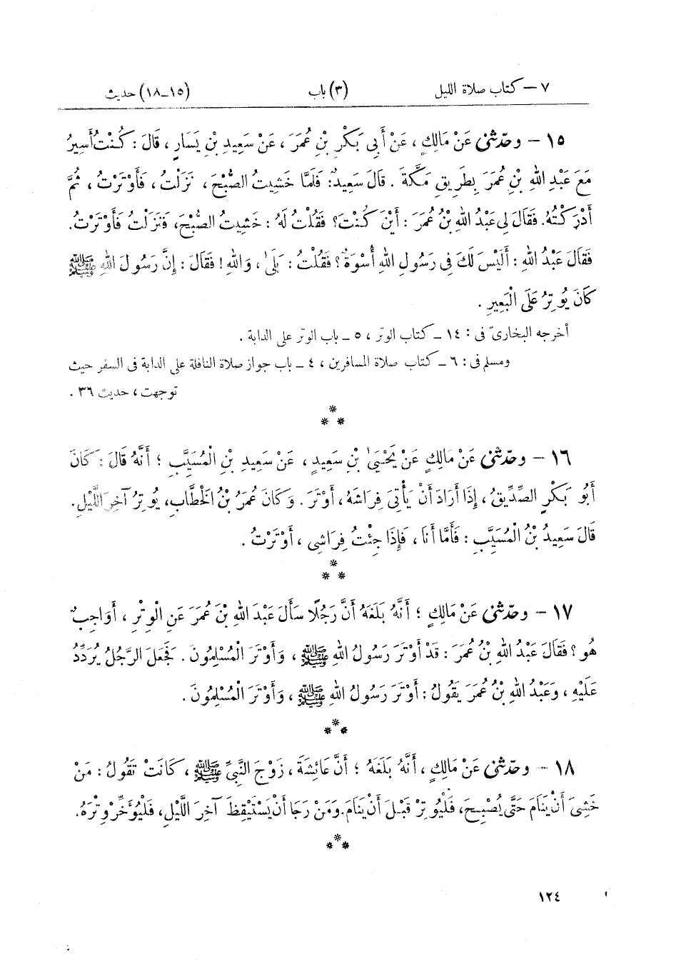 ١٦ - وَحَدَّثَنِي عَنْ مَالِكٍ، عَنْ يَحْيَى بْنِ سَعِيدٍ، عَنْ سَعِيدِ بْنِ الْمُسَيِّبِ أَنَّهُ قَالَ: «كَانَ أَبُو بَكْرٍ الصِّدِّيقُ إِذَا أَرَادَ أَنْ يَأْتِيَ فِرَاشَهُ أَوْتَرَ»، وَكَانَ عُمَرُ بْنُ الْخَطَّابِ «يُوتِرُ آخِرَ اللَّيْلِ». قَالَ سَعِيدُ بْنُ الْمُسَيِّبِ: فَأَمَّا أَنَا فَإِذَا جِئْتُ فِرَاشِي أَوْتَرْتُ