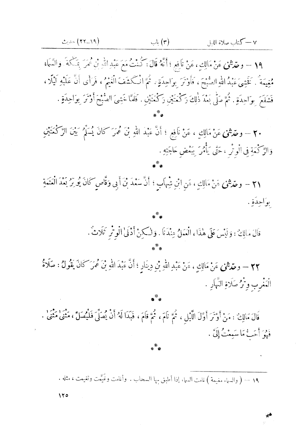 ٢٠ - وَحَدَّثَنِي عَنْ مَالِكٍ عَنْ نَافِعٍ، أَنَّ عَبْدَ اللَّهِ بْنَ عُمَرَ كَانَ «يُسَلِّمُ بَيْنَ الرَّكْعَتَيْنِ وَالرَّكْعَةِ فِي الْوِتْرِ، حَتَّى يَأْمُرَ بِبَعْضِ حَاجَتِهِ»