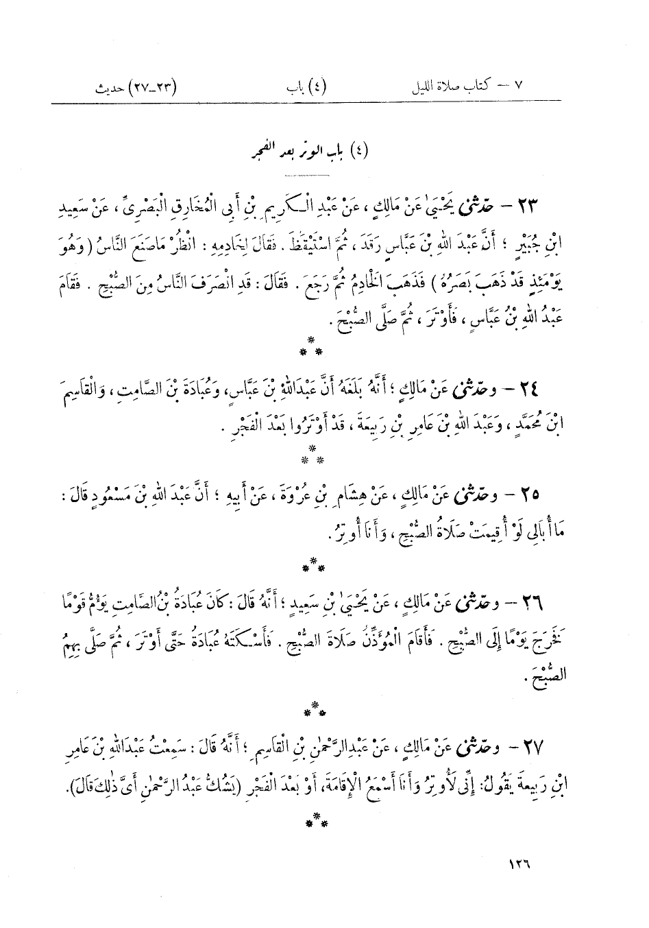 ٢٤ - وَحَدَّثَنِي عَنْ مَالِكٍ أَنَّهُ بَلَغَهُ أَنَّ عَبْدَ اللَّهِ بْنَ عَبَّاسٍ، وَعُبَادَةَ بْنَ الصَّامِتِ، وَالْقَاسِمَ بْنَ مُحَمَّدٍ وَعَبْدَ اللَّهِ بْنَ عَامِرِ بْنِ رَبِيعَةَ، قَدْ «أَوْتَرُوا بَعْدَ الْفَجْرِ»
