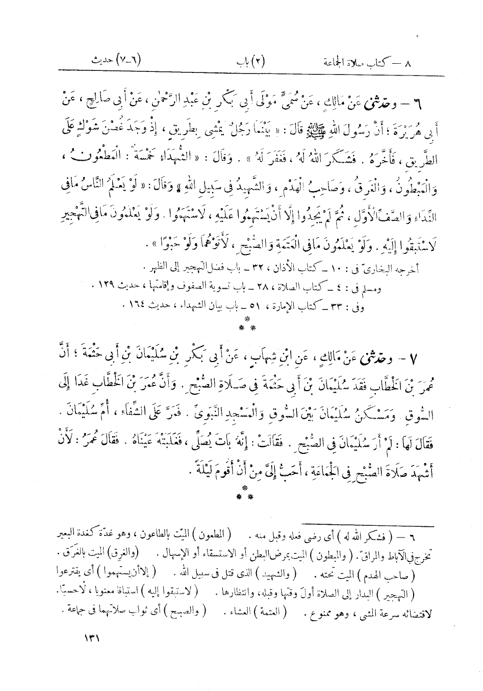 ٧ - وَحَدَّثَنِي عَنْ مَالِكٍ، عَنْ ابْنِ شِهَابٍ، عَنْ أَبِي بَكْرِ بْنِ سُلَيْمَانَ بْنِ أَبِي حَثْمَةَ، أَنَّ عُمَرَ بْنَ الْخَطَّابِ فَقَدَ سُلَيْمَانَ بْنَ أَبِي حَثْمَةَ فِي صَلَاةِ الصُّبْحِ، وَأَنَّ عُمَرَ بْنَ الْخَطَّابِ غَدَا إِلَى السُّوقِ. وَمَسْكَنُ سُلَيْمَانَ بَيْنَ السُّوقِ وَالْمَسْجِدِ النَّبَوِيِّ فَمَرَّ عَلَى الشِّفَاءِ أُمِّ سُلَيْمَانَ، فَقَالَ لَهَا: «لَمْ أَرَ سُلَيْمَانَ فِي الصُّبْحِ». فَقَالَتْ: إِنَّهُ بَاتَ يُصَلِّي، فَغَلَبَتْهُ عَيْنَاهُ، فَقَالَ عُمَرُ: «لَأَنْ أَشْهَدَ صَلَاةَ الصُّبْحِ فِي الْجَمَاعَةِ أَحَبُّ إِلَيَّ مِنْ أَنْ أَقُومَ لَيْلَةً»