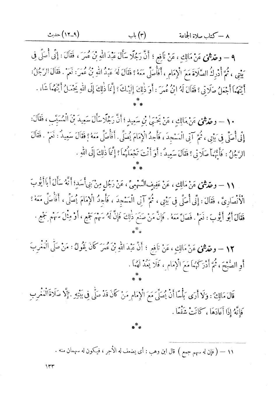 ١٢ - وَحَدَّثَنِي عَنْ مَالِكٍ عَنْ نَافِعٍ، أَنَّ عَبْدَ اللَّهِ بْنَ عُمَرَ كَانَ يَقُولُ: «مَنْ صَلَّى الْمَغْرِبَ أَوِ الصُّبْحَ، ثُمَّ أَدْرَكَهُمَا مَعَ الْإِمَامِ، فَلَا يَعُدْ لَهُمَا» قَالَ مَالِكٌ: «وَلَا أَرَى بَأْسًا أَنْ يُصَلِّيَ مَعَ الْإِمَامِ مَنْ كَانَ قَدْ صَلَّى فِي بَيْتِهِ، إِلَّا صَلَاةَ الْمَغْرِبِ فَإِنَّهُ إِذَا أَعَادَهَا، كَانَتْ شَفْعًا»