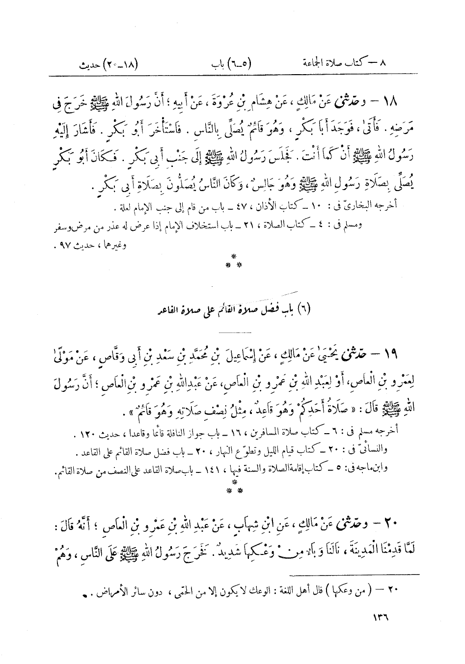 ١٨ - وَحَدَّثَنِي عَنْ مَالِكٍ، عَنْ هِشَامِ بْنِ عُرْوَةَ، عَنْ أَبِيهِ، أَنَّ رَسُولَ اللَّهِ صَلَّى اللهُ عَلَيْهِ وَسَلَّمَ خَرَجَ فِي مَرَضِهِ. فَأَتَى فَوَجَدَ أَبَا بَكْرٍ وَهُوَ قَائِمٌ يُصَلِّي بِالنَّاسِ، فَاسْتَأْخَرَ أَبُو بَكْرٍ. «فَأَشَارَ إِلَيْهِ رَسُولُ اللَّهِ صَلَّى اللهُ عَلَيْهِ وَسَلَّمَ أَنْ كَمَا أَنْتَ». فَجَلَسَ رَسُولُ اللَّهِ صَلَّى اللهُ عَلَيْهِ وَسَلَّمَ إِلَى جَنْبِ أَبِي بَكْرٍ. فَكَانَ أَبُو بَكْرٍ يُصَلِّي بِصَلَاةِ رَسُولِ اللَّهِ صَلَّى اللهُ عَلَيْهِ وَسَلَّمَ وَهُوَ جَالِسٌ، وَكَانَ النَّاسُ يُصَلُّونَ بِصَلَاةِ أَبِي بَكْرٍ