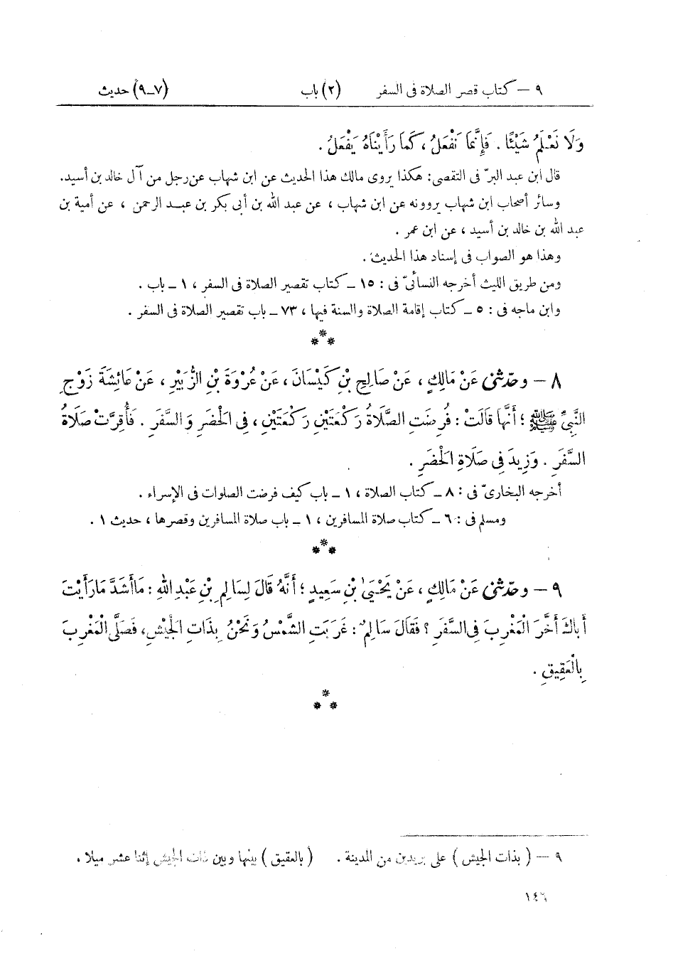 ٨ - وَحَدَّثَنِي عَنْ مَالِكٍ، عَنْ صَالِحِ بْنِ كَيْسَانَ، عَنْ عُرْوَةَ بْنِ الزُّبَيْرِ، عَنْ عَائِشَةَ زَوْجِ النَّبِيِّ صَلَّى اللهُ عَلَيْهِ وَسَلَّمَ، أَنَّهَا قَالَتْ: «فُرِضَتِ الصَّلَاةُ رَكْعَتَيْنِ رَكْعَتَيْنِ، فِي الْحَضَرِ وَالسَّفَرِ، فَأُقِرَّتْ صَلَاةُ السَّفَرِ، وَزِيدَ فِي صَلَاةِ الْحَضَرِ»