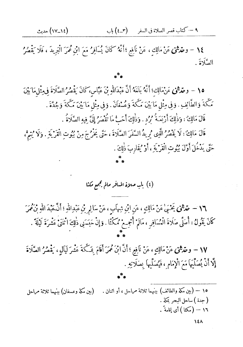 ١٥ - وَحَدَّثَنِي عَنْ مَالِكٍ أَنَّهُ بَلَغَهُ أَنَّ عَبْدَ اللَّهِ بْنَ عَبَّاسٍ كَانَ «يَقْصُرُ الصَّلَاةَ فِي مِثْلِ مَا بَيْنَ مَكَّةَ وَالطَّائِفِ، وَفِي مِثْلِ مَا بَيْنَ مَكَّةَ وَعُسْفَانَ، وَفِي مِثْلِ مَا بَيْنَ مَكَّةَ وَجُدَّةَ» قَالَ مَالِكٌ: «وَذَلِكَ أَرْبَعَةُ بُرُدٍ، وَذَلِكَ أَحَبُّ مَا تُقْصَرُ إِلَيَّ فِيهِ الصَّلَاةُ» قَالَ مَالِكٌ: «لَا يَقْصُرُ الَّذِي يُرِيدُ السَّفَرَ الصَّلَاةَ، حَتَّى يَخْرُجَ مِنْ بُيُوتِ الْقَرْيَةِ، وَلَا يُتِمُّ حَتَّى يَدْخُلَ أَوَّلَ بُيُوتِ الْقَرْيَةِ أَوْ يُقَارِبَ ذَلِكَ»