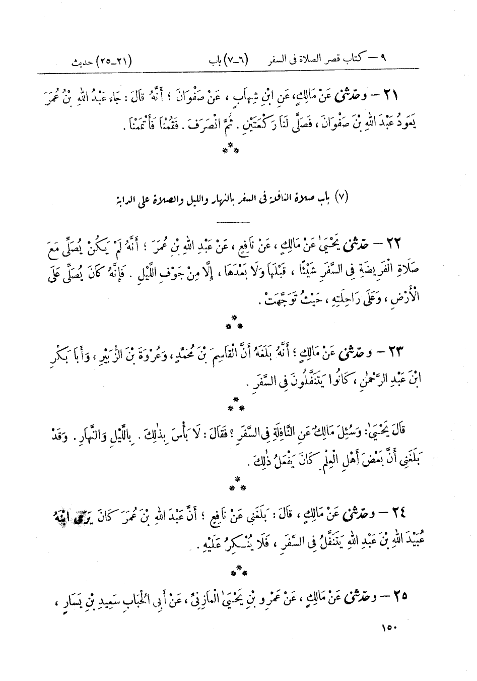 ٢٤ - وَحَدَّثَنِي عَنْ مَالِكٍ، قَالَ: بَلَغَنِي عَنْ نَافِعٍ، أَنَّ عَبْدَ اللَّهِ بْنَ عُمَرَ «كَانَ يَرَى ابْنَهُ عُبَيْدَ اللَّهِ بْنَ عَبْدِ اللَّهِ يَتَنَفَّلُ فِي السَّفَرِ فَلَا يُنْكِرُ عَلَيْهِ»