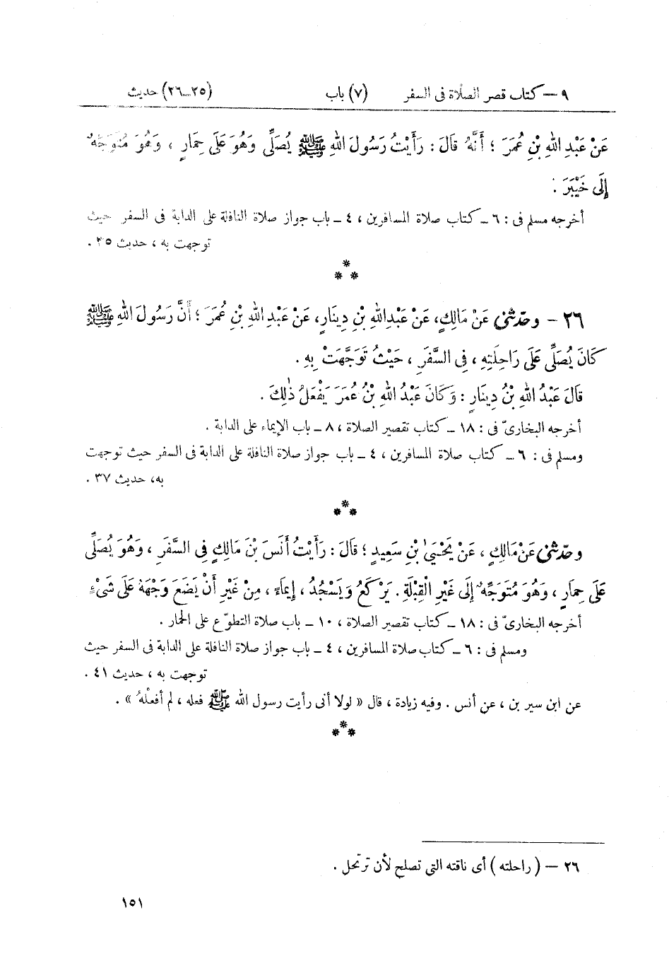 ٢٦ - وَحَدَّثَنِي عَنْ مَالِكٍ، عَنْ عَبْدِ اللَّهِ بْنِ دِينَارٍ، عَنْ عَبْدِ اللَّهِ بْنِ عُمَرَ أَنَّ رَسُولَ اللَّهِ صَلَّى اللهُ عَلَيْهِ وَسَلَّمَ كَانَ «يُصَلِّي عَلَى رَاحِلَتِهِ فِي السَّفَرِ حَيْثُ تَوَجَّهَتْ بِهِ»، قَالَ عَبْدُ اللَّهِ بْنُ دِينَارٍ وَكَانَ عَبْدُ اللَّهِ بْنُ عُمَرَ يَفْعَلُ ذَلِكَ