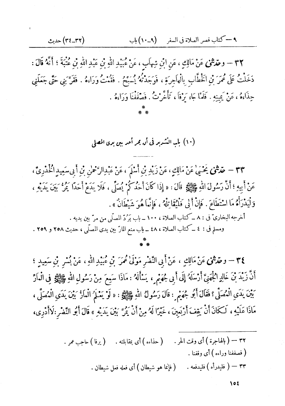 ٣٤ - وَحَدَّثَنِي عَنْ مَالِكٍ، عَنْ أَبِي النَّضْرِ مَوْلَى عُمَرَ بْنِ عُبَيْدِ اللَّهِ عَنْ بُسْرِ بْنِ سَعِيدٍ أَنَّ زَيْدَ بْنَ خَالِدٍ الْجُهَنِيَّ أَرْسَلَهُ إِلَى أَبِي جُهَيْمٍ يَسْأَلُهُ، مَاذَا سَمِعَ مِنْ رَسُولِ اللَّهِ صَلَّى اللهُ عَلَيْهِ وَسَلَّمَ فِي الْمَارِّ بَيْنَ يَدَيِ الْمُصَلِّي؟ فَقَالَ أَبُو جُهَيْمٍ قَالَ رَسُولُ اللَّهِ صَلَّى اللهُ عَلَيْهِ وَسَلَّمَ: «لَوْ يَعْلَمُ الْمَارُّ بَيْنَ يَدَيِ الْمُصَلِّي، مَاذَا عَلَيْهِ، لَكَانَ أَنْ يَقِفَ أَرْبَعِينَ، خَيْرًا لَهُ مِنْ أَنْ يَمُرَّ بَيْنَ يَدَيْهِ»، قَالَ أَبُو النَّضْرِ: لَا أَدْرِي ⦗١٥٥⦘ أَقَالَ أَرْبَعِينَ يَوْمًا أَوْ شَهْرًا أَوْ سَنَةً
