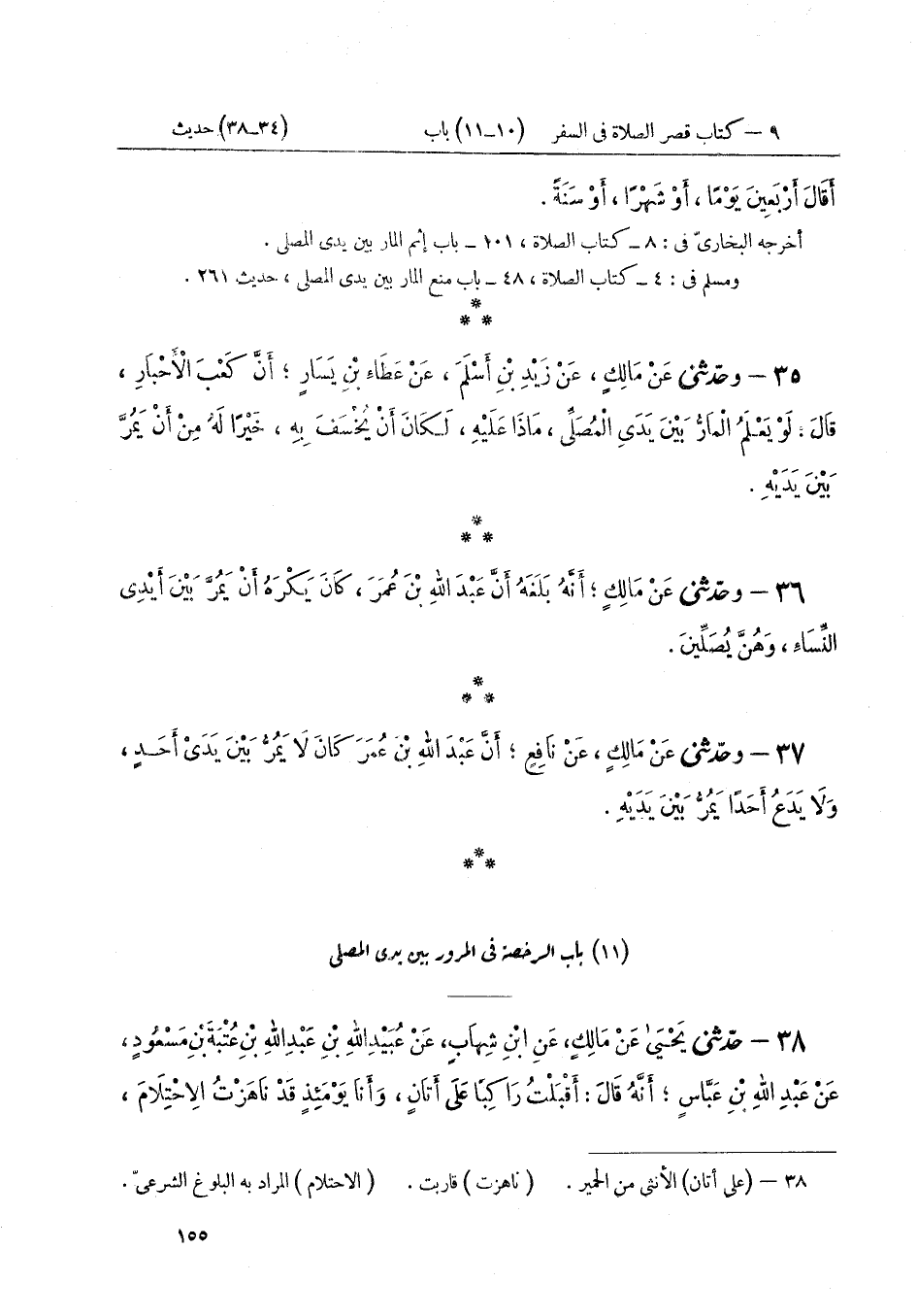 ٣٦ - وَحَدَّثَنِي عَنْ مَالِكٍ أَنَّهُ بَلَغَهُ أَنَّ عَبْدَ اللَّهِ بْنَ عُمَرَ كَانَ «يَكْرَهُ أَنْ يَمُرَّ بَيْنَ أَيْدِي النِّسَاءِ، وَهُنَّ يُصَلِّينَ»