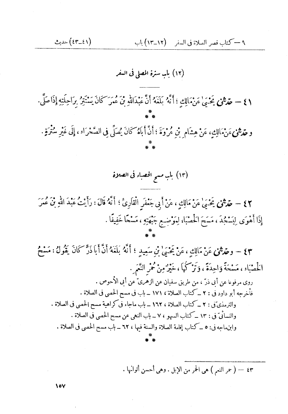 ٤٣ - وَحَدَّثَنِي عَنْ مَالِكٍ، عَنْ يَحْيَى بْنِ سَعِيدٍ، أَنَّهُ بَلَغَهُ أَنَّ أَبَا ذَرٍّ كَانَ يَقُولُ: «مَسْحُ الْحَصْبَاءِ مَسْحَةً وَاحِدَةً، وَتَرْكُهَا، خَيْرٌ مِنْ حُمْرِ النَّعَمِ»