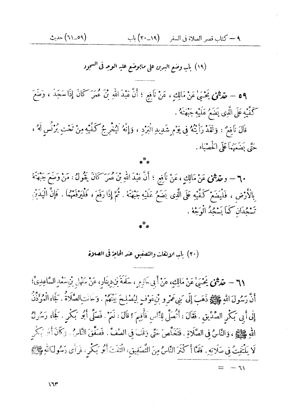 ٦١ - حَدَّثَنِي يَحْيَى، عَنْ مَالِكٍ، عَنْ أَبِي حَازِمٍ سَلَمَةَ بْنِ دِينَارٍ، عَنْ سَهْلِ بْنِ سَعْدٍ السَّاعِدِيِّ، أَنَّ رَسُولَ اللَّهِ صَلَّى اللهُ عَلَيْهِ وَسَلَّمَ ذَهَبَ إِلَى بَنِي عَمْرِو بْنِ عَوْفٍ لِيُصْلِحَ بَيْنَهُمْ. وَحَانَتِ الصَّلَاةُ. فَجَاءَ الْمُؤَذِّنُ إِلَى أَبِي بَكْرٍ الصِّدِّيقِ، فَقَالَ: أَتُصَلِّي لِلنَّاسِ فَأُقِيمَ؟ قَالَ: نَعَمْ. فَصَلَّى أَبُو بَكْرٍ فَجَاءَ رَسُولُ اللَّهِ صَلَّى اللهُ عَلَيْهِ وَسَلَّمَ، وَالنَّاسُ فِي الصَّلَاةِ. فَتَخَلَّصَ حَتَّى وَقَفَ فِي الصَّفِّ. فَصَفَّقَ النَّاسُ. وَكَانَ أَبُو بَكْرٍ لَا يَلْتَفِتُ فِي صَلَاتِهِ. فَلَمَّا أَكْثَرَ النَّاسُ مِنَ التَّصْفِيقِ، الْتَفَتَ أَبُو بَكْرٍ، فَرَأَى رَسُولَ اللَّهِ صَلَّى اللهُ عَلَيْهِ وَسَلَّمَ ⦗١٦٤⦘ «فَأَشَارَ إِلَيْهِ رَسُولُ اللَّهِ صَلَّى اللهُ عَلَيْهِ وَسَلَّمَ أَنِ امْكُثْ مَكَانَكَ». فَرَفَعَ أَبُو بَكْرٍ يَدَيْهِ، فَحَمِدَ اللَّهَ عَلَى مَا أَمَرَهُ بِهِ رَسُولُ اللَّهِ صَلَّى اللهُ عَلَيْهِ وَسَلَّمَ مِنْ ذَلِكَ، ثُمَّ اسْتَأْخَرَ حَتَّى اسْتَوَى فِي الصَّفِّ. وَتَقَدَّمَ رَسُولُ اللَّهِ صَلَّى اللهُ عَلَيْهِ وَسَلَّمَ فَصَلَّى، ثُمَّ انْصَرَفَ. فَقَالَ: «يَا أَبَا بَكْرٍ مَا مَنَعَكَ أَنْ تَثْبُتَ إِذْ أَمَرْتُكَ»، فَقَالَ أَبُو بَكْرٍ: مَا كَانَ لِابْنِ أَبِي قُحَافَةَ، أَنْ يُصَلِّيَ بَيْنَ يَدَيْ رَسُولِ اللَّهِ صَلَّى اللهُ عَلَيْهِ وَسَلَّمَ. فَقَالَ رَسُولُ اللَّهِ صَلَّى اللهُ عَلَيْهِ وَسَلَّمَ: «مَا لِي رَأَيْتُكُمْ أَكْثَرْتُمْ مِنَ التَّصْفِيحِ؟ مَنْ نَابَهُ شَيْءٌ فِي صَلَاتِهِ فَلْيُسَبِّحْ. فَإِنَّهُ إِذَا سَبَّحَ الْتُفِتَ إِلَيْهِ وَإِنَّمَا التَّصْفِيحُ لِلنِّسَاءِ»