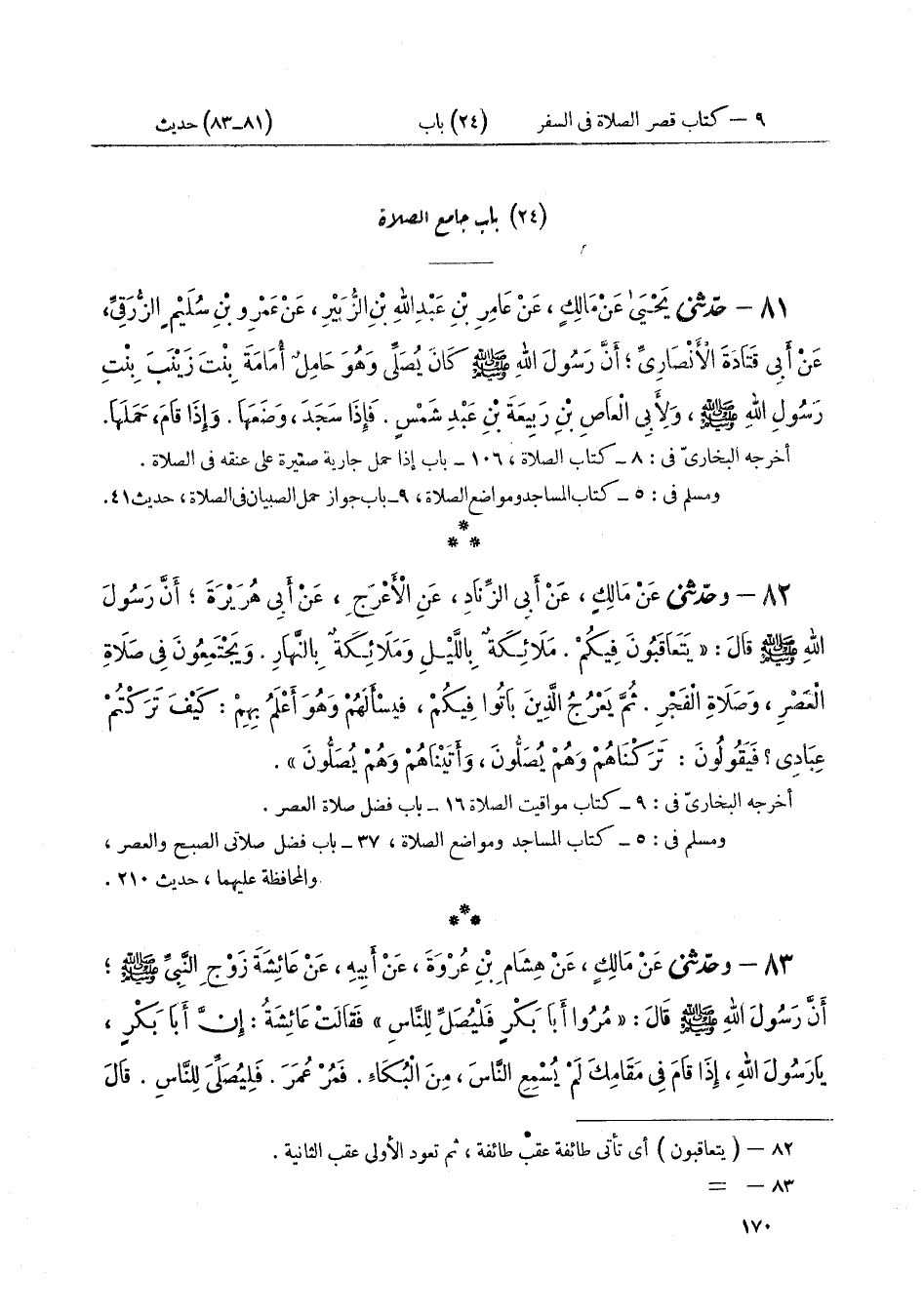 ٨١ - حَدَّثَنِي يَحْيَى، عَنْ مَالِكٍ، عَنْ عَامِرِ بْنِ عَبْدِ اللَّهِ بْنِ الزُّبَيْرِ، عَنْ عَمْرِو بْنِ سُلَيْمٍ الزُّرَقِيِّ، عَنْ أَبِي قَتَادَةَ الْأَنْصَارِيِّ أَنَّ رَسُولَ اللَّهِ صَلَّى اللهُ عَلَيْهِ وَسَلَّمَ كَانَ «يُصَلِّي وَهُوَ حَامِلٌ أُمَامَةَ بِنْتَ زَيْنَبَ» بِنْتِ رَسُولِ اللَّهِ صَلَّى اللهُ عَلَيْهِ وَسَلَّمَ، وَلِأَبِي الْعَاصِ بْنِ رَبِيعَةَ بْنِ عَبْدِ شَمْسٍ، «فَإِذَا سَجَدَ، وَضَعَهَا. وَإِذَا قَامَ حَمَلَهَا»