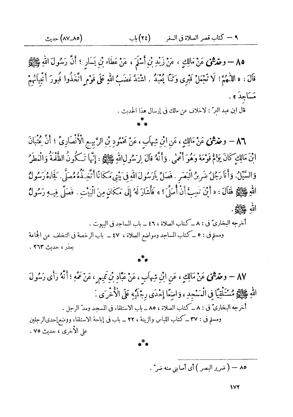 ٨٥ - وَحَدَّثَنِي عَنْ مَالِكٍ، عَنْ زَيْدِ بْنِ أَسْلَمَ، عَنْ عَطَاءِ بْنِ يَسَارٍ، أَنَّ رَسُولَ اللَّهِ صَلَّى اللهُ عَلَيْهِ وَسَلَّمَ قَالَ: «اللَّهُمَّ لَا تَجْعَلْ قَبْرِي وَثَنًا يُعْبَدُ. اشْتَدَّ غَضَبُ اللَّهِ عَلَى قَوْمٍ اتَّخَذُوا قُبُورَ أَنْبِيَائِهِمْ مَسَاجِدَ»