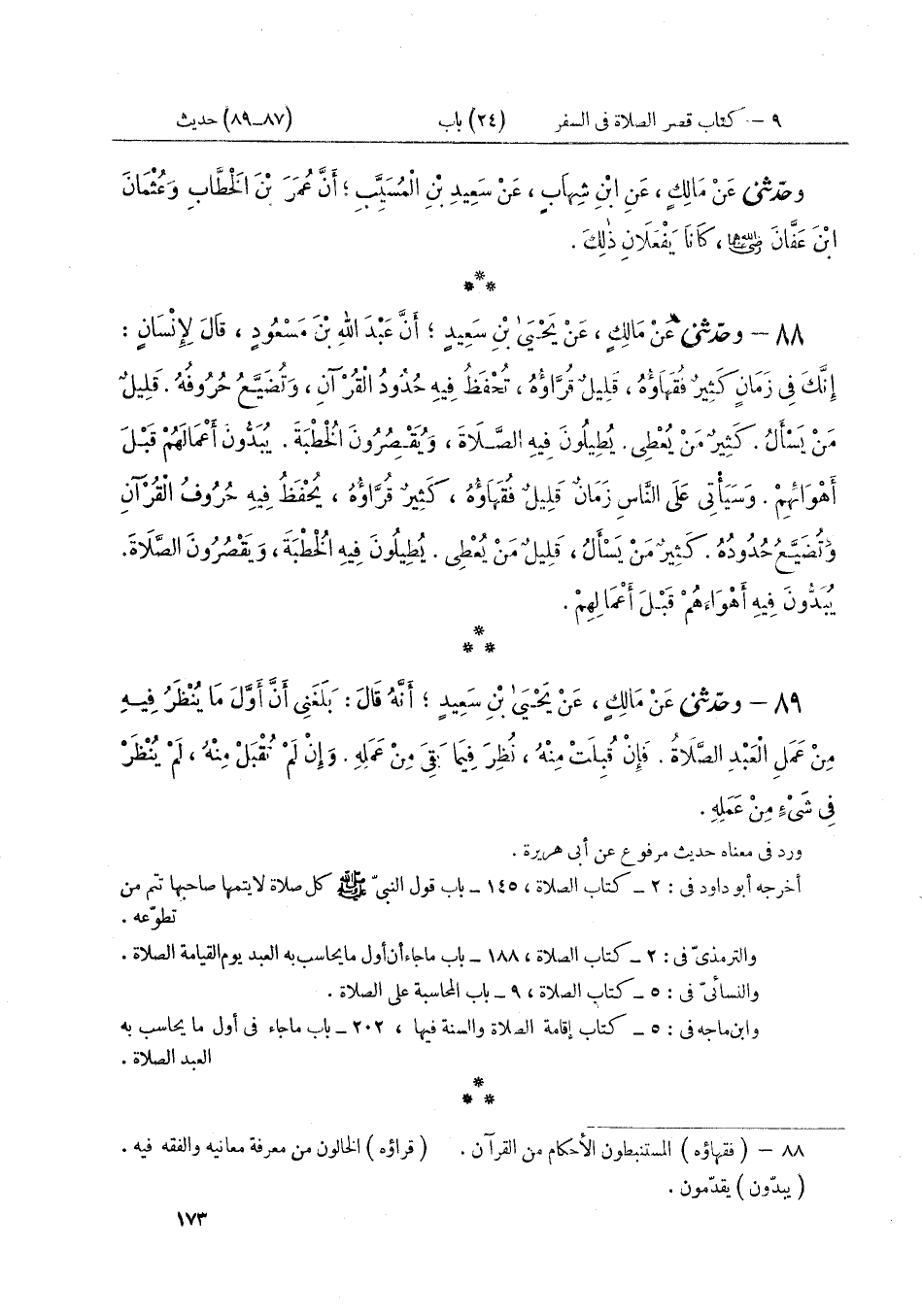 ٨٨ - وَحَدَّثَنِي عَنْ مَالِكٍ، عَنْ يَحْيَى بْنِ سَعِيدٍ، أَنَّ عَبْدَ اللَّهِ بْنَ مَسْعُودٍ، قَالَ لِإِنْسَانٍ: «إِنَّكَ فِي زَمَانٍ كَثِيرٌ فُقَهَاؤُهُ، قَلِيلٌ قُرَّاؤُهُ، تُحْفَظُ فِيهِ حُدُودُ الْقُرْآنِ، وَتُضَيَّعُ حُرُوفُهُ. قَلِيلٌ مَنْ يَسْأَلُ. كَثِيرٌ مَنْ يُعْطِي. يُطِيلُونَ فِيهِ الصَّلَاةَ، وَيَقْصُرُونَ الْخُطْبَةَ يُبَدُّونَ. أَعْمَالَهُمْ قَبْلَ أَهْوَائِهِمْ، وَسَيَأْتِي عَلَى النَّاسِ زَمَانٌ قَلِيلٌ فُقَهَاؤُهُ، كَثِيرٌ قُرَّاؤُهُ، يُحْفَظُ فِيهِ حُرُوفُ الْقُرْآنِ وَتُضَيَّعُ حُدُودُهُ. كَثِيرٌ مَنْ يَسْأَلُ، قَلِيلٌ مَنْ يُعْطِي، يُطِيلُونَ فِيهِ الْخُطْبَةَ، وَيَقْصُرُونَ الصَّلَاةَ. يُبَدُّونَ فِيهِ أَهْوَاءَهُمْ قَبْلَ أَعْمَالِهِمْ»