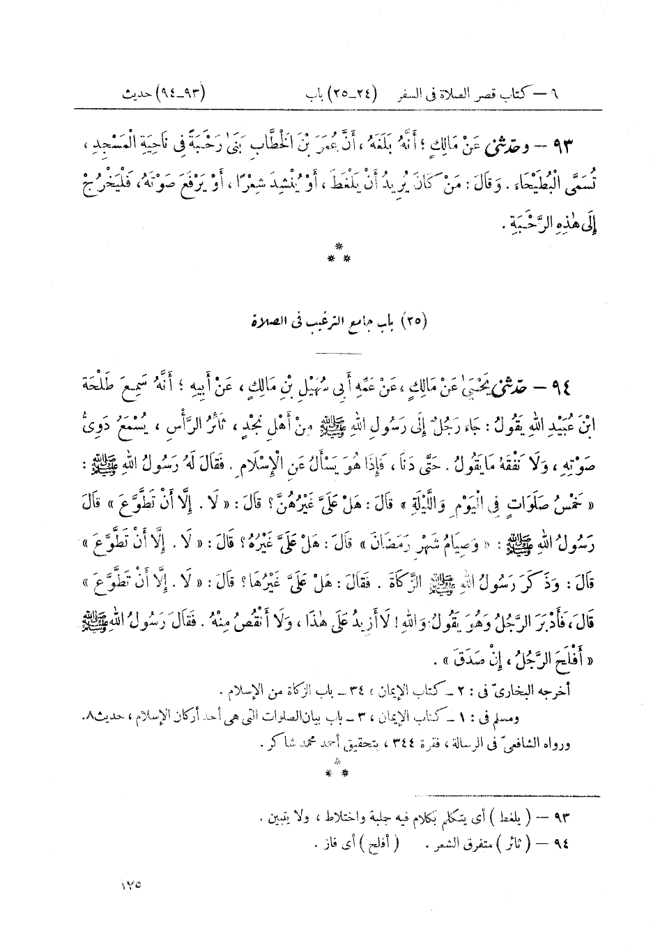 ٩٤ - حَدَّثَنِي يَحْيَى، عَنْ مالِكٍ عَنْ عَمِّهِ أَبِي سُهَيْلِ بْنِ مَالِكٍ، عَنْ أَبِيهِ، أَنَّهُ سَمِعَ طَلْحَةَ بْنَ عُبَيْدِ اللَّهِ يَقُولُ: جَاءَ رَجُلٌ إِلَى رَسُولِ اللَّهِ صَلَّى اللهُ عَلَيْهِ وَسَلَّمَ مِنْ أَهْلِ نَجْدٍ، ثَائِرُ الرَّأْسِ يُسْمَعُ دَوِيُّ صَوْتِهِ، وَلَا نَفْقَهُ مَا يَقُولُ. حَتَّى دَنَا، فَإِذَا هُوَ يَسْأَلُ عَنِ الْإِسْلَامِ. فَقَالَ لَهُ رَسُولُ اللَّهِ صَلَّى اللهُ عَلَيْهِ وَسَلَّمَ: «خَمْسُ صَلَوَاتٍ فِي الْيَوْمِ وَاللَّيْلَةِ»، قَالَ: هَلْ عَلَيَّ غَيْرُهُنَّ؟ قَالَ: «لَا. إِلَّا أَنْ تَطَّوَّعَ»، قَالَ رَسُولُ اللَّهِ صَلَّى اللهُ عَلَيْهِ وَسَلَّمَ: «وَصِيَامُ شَهْرِ رَمَضَانَ»، قَالَ: هَلْ عَلَيَّ غَيْرُهُ؟ قَالَ: «لَا. إِلَّا أَنْ تَطَّوَّعَ»، قَالَ: وَذَكَرَ رَسُولُ اللَّهِ صَلَّى اللهُ عَلَيْهِ وَسَلَّمَ «الزَّكَاةَ». فَقَالَ: هَلْ عَلَيَّ غَيْرُهَا؟ قَالَ: «لَا. إِلَّا أَنْ تَطَّوَّعَ»، قَالَ: فَأَدْبَرَ الرَّجُلُ وَهُوَ يَقُولُ: وَاللَّهِ لَا أَزِيدُ عَلَى هَذَا، وَلَا أَنْقُصُ مِنْهُ، فَقَالَ رَسُولُ اللَّهِ صَلَّى اللهُ عَلَيْهِ وَسَلَّمَ: «أَفْلَحَ الرَّجُلُ إِنْ صَدَقَ»