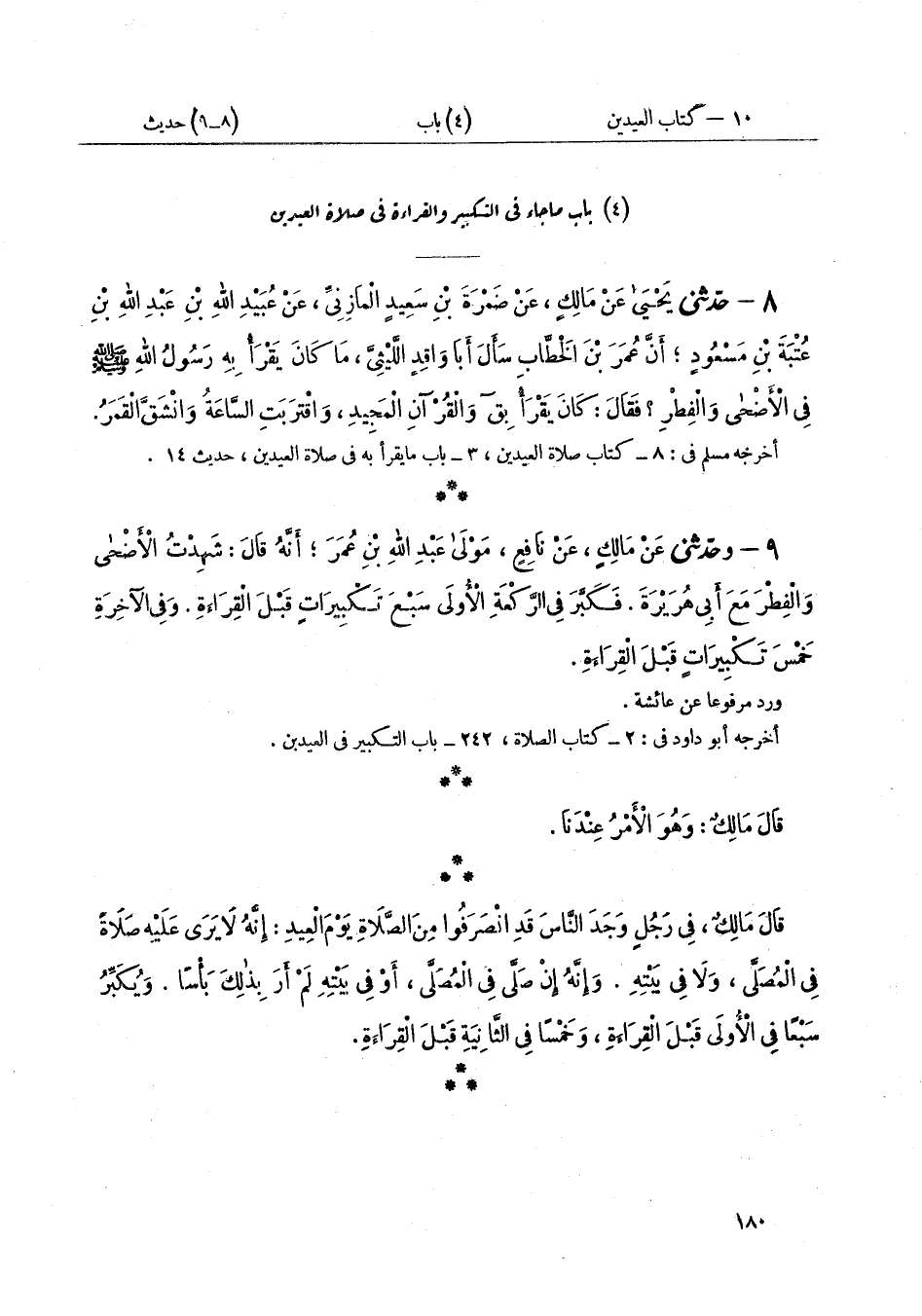 ٩ - وَحَدَّثَنِي عَنْ مَالِكٍ عَنْ نَافِعٍ، مَوْلَى عَبْدِ اللَّهِ بْنِ عُمَرَ، أَنَّهُ قَالَ: شَهِدْتُ الْأَضْحَى وَالْفِطْرَ مَعَ أَبِي هُرَيْرَةَ «فَكَبَّرَ فِي الرَّكْعَةِ الْأُولَى سَبْعَ تَكْبِيرَاتٍ قَبْلَ الْقِرَاءَةِ، وَفِي الْآخِرَةِ خَمْسَ تَكْبِيرَاتٍ قَبْلَ الْقِرَاءَةِ» قَالَ مَالِكٌ: «وَهُوَ الْأَمْرُ عِنْدَنَا» قَالَ مَالِكٌ: فِي رَجُلٍ وَجَدَ النَّاسَ قَدِ انْصَرَفُوا مِنَ الصَّلَاةِ يَوْمَ الْعِيدِ: «إِنَّهُ لَا يَرَى عَلَيْهِ صَلَاةً فِي الْمُصَلَّى، وَلَا فِي بَيْتِهِ، وَإِنَّهُ إِنْ صَلَّى فِي الْمُصَلَّى، أَوْ فِي بَيْتِهِ لَمْ أَرَ بِذَلِكَ بَأْسًا، وَيُكَبِّرُ سَبْعًا فِي الْأُولَى قَبْلَ الْقِرَاءَةِ، وَخَمْسًا فِي الثَّانِيَةِ قَبْلَ الْقِرَاءَةِ»