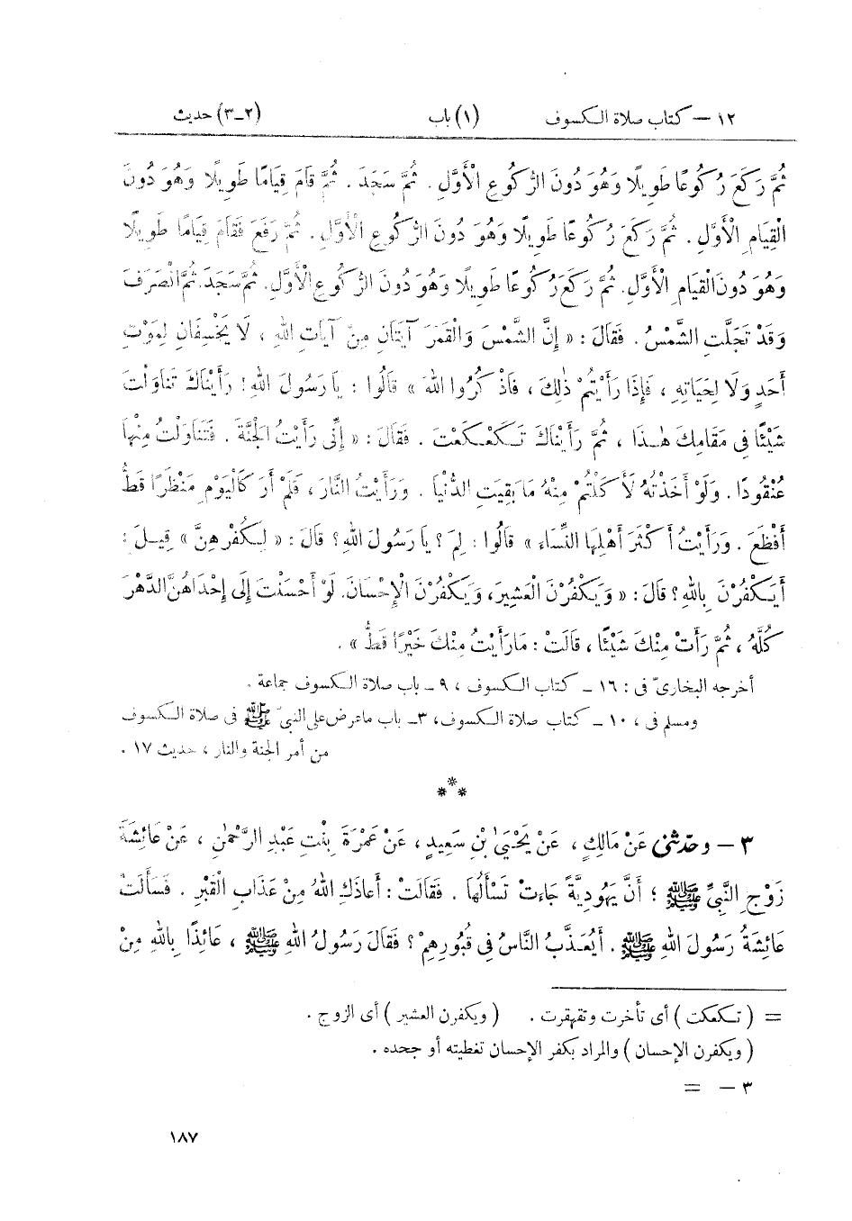 ٣ - وَحَدَّثَنِي عَنْ مَالِكٍ، عَنْ يَحْيَى بْنِ سَعِيدٍ، عَنْ عَمْرَةَ بِنْتِ عَبْدِ الرَّحْمَنِ، عَنْ عَائِشَةَ زوْجِ النَّبِيِّ صَلَّى اللهُ عَلَيْهِ وَسَلَّمَ، أَنَّ يَهُوديَّةً جَاءَتْ تَسْأَلُهَا. فَقَالَتْ: أَعَاذَكِ اللَّهُ مِنْ عَذَابِ الْقَبْرِ. فَسَأَلَتْ عَائِشَةُ رَسُولَ اللَّهِ صَلَّى اللهُ عَلَيْهِ وَسَلَّمَ: أَيُعَذَّبُ النَّاسُ فِي قُبُورِهِمْ؟ فَقَالَ رَسُولُ اللَّهِ صَلَّى اللهُ عَلَيْهِ وَسَلَّمَ، «عَائِذًا بِاللَّهِ مِنْ ⦗١٨٨⦘ ذَلِكَ». ثُمَّ رَكِبَ رَسُولُ اللَّهِ صَلَّى اللهُ عَلَيْهِ وَسَلَّمَ، ذَاتَ غَدَاةٍ مَرْكَبًا. فَخَسَفَتِ الشَّمْسُ. فَرَجَعَ ضُحًى. فَمَرَّ بَيْنَ ظَهْرَانَيِ الْحُجَرِ. ثُمَّ قَامَ يُصَلِّي وَقَامَ النَّاسُ وَرَاءَهُ. فَقَامَ قِيَامًا طَوِيلًا. ثُمَّ رَكَعَ رُكُوعًا طَوِيلًا. ثُمَّ رَفَعَ فَقَامَ قِيَامًا طَوِيلًا وَهُوَ دُونَ الْقِيَامِ الْأَوَّلِ. ثُمَّ رَكَعَ رُكُوعًا طَوِيلًا وَهُوَ دُونَ الرُّكُوعِ الْأَوَّلِ. ثُمَّ رَفَعَ فَسَجَدَ. ثُمَّ قَامَ قِيَامًا طَوِيلًا وَهُوَ دُونَ الْقِيَامِ الْأَوَّلِ. ثُمَّ رَكَعَ رُكُوعًا طَوِيلًا وَهُوَ دُونَ الرُّكُوعِ الْأَوَّلِ. ثُمَّ رَفَعَ فَقَامَ قِيَامًا طَوِيلًا وَهُوَ دُونَ الْقِيَامِ الْأَوَّلِ. ثُمَّ رَكَعَ رُكُوعًا طَوِيلًا وَهُوَ دُونَ الرُّكُوعِ الْأَوَّلِ. ثُمَّ رَفَعَ ثُمَّ سَجَدَ. ثُمَّ انْصَرَفَ، فَقَالَ مَا شَاءَ اللَّهُ أَنْ يَقُولَ. ثُمَّ «أَمَرَهُمْ أَنْ يَتَعَوَّذُوا مِنْ عَذَابِ الْقَبْرِ»