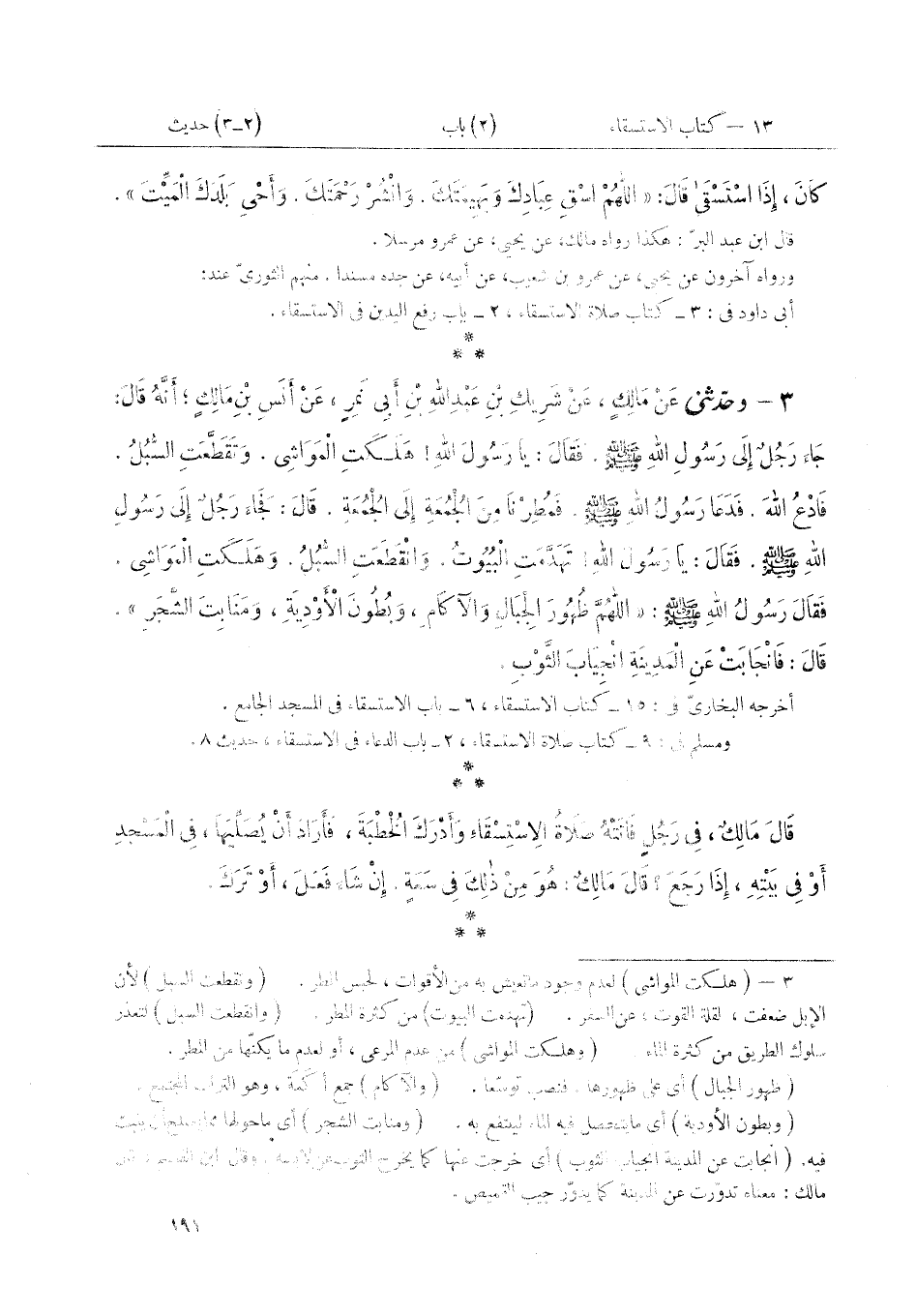 ٣ - وَحَدَّثَنِي عَنْ مَالِكٍ، عَنْ شَرِيكِ بْنِ عَبْدِ اللَّهِ بْنِ أَبِي نَمِرٍ، عَنْ أَنَسِ بْنِ مَالِكٍ، أَنَّهُ قَالَ: جَاءَ رَجُلٌ إِلَى رَسُولِ اللَّهِ صَلَّى اللهُ عَلَيْهِ وَسَلَّمَ، فَقَالَ: يَا رَسُولَ اللَّهِ هَلَكَتِ الْمَوَاشِي، وَتَقَطَّعَتِ السُّبُلُ، فَادْعُ اللَّهَ. «فَدَعَا رَسُولُ اللَّهِ صَلَّى اللهُ عَلَيْهِ وَسَلَّمَ. فَمُطِرْنَا مِنَ الْجُمُعَةِ إِلَى الْجُمُعَةِ». قَالَ: فَجَاءَ رَجُلٌ إِلَى رَسُولِ اللَّهِ صَلَّى اللهُ عَلَيْهِ وَسَلَّمَ. فَقَالَ: يَا رَسُولَ اللَّهِ تَهَدَّمَتِ الْبُيُوتُ، وَانْقَطَعَتِ السُّبُلُ، وَهَلَكَتِ الْمَوَاشِي، فَقَالَ رَسُولُ اللَّهِ صَلَّى اللهُ عَلَيْهِ وَسَلَّمَ: «اللَّهُمَّ ظُهُورَ الْجِبَالِ وَالْآكَامِ وَبُطُونَ الْأَوْدِيَةِ وَمَنَابِتَ الشَّجَرِ». قَالَ: فَانْجَابَتْ عَنِ الْمَدِينَةِ انْجِيَابَ الثَّوْبِ قَالَ مَالِكٌ: فِي رَجُلٍ فَاتَتْهُ صَلَاةُ الِاسْتِسْقَاءِ وَأَدْرَكَ الْخُطْبَةَ، فَأَرَادَ أَنْ يُصَلِّيَهَا، فِي الْمَسْجِدِ أَوْ فِي بَيْتِهِ إِذَا رَجَعَ؟ قَالَ مَالِكٌ: «هُوَ مِنْ ذَلِكَ فِي سَعَةٍ. إِنْ شَاءَ فَعَلَ أَوْ تَرَكَ»