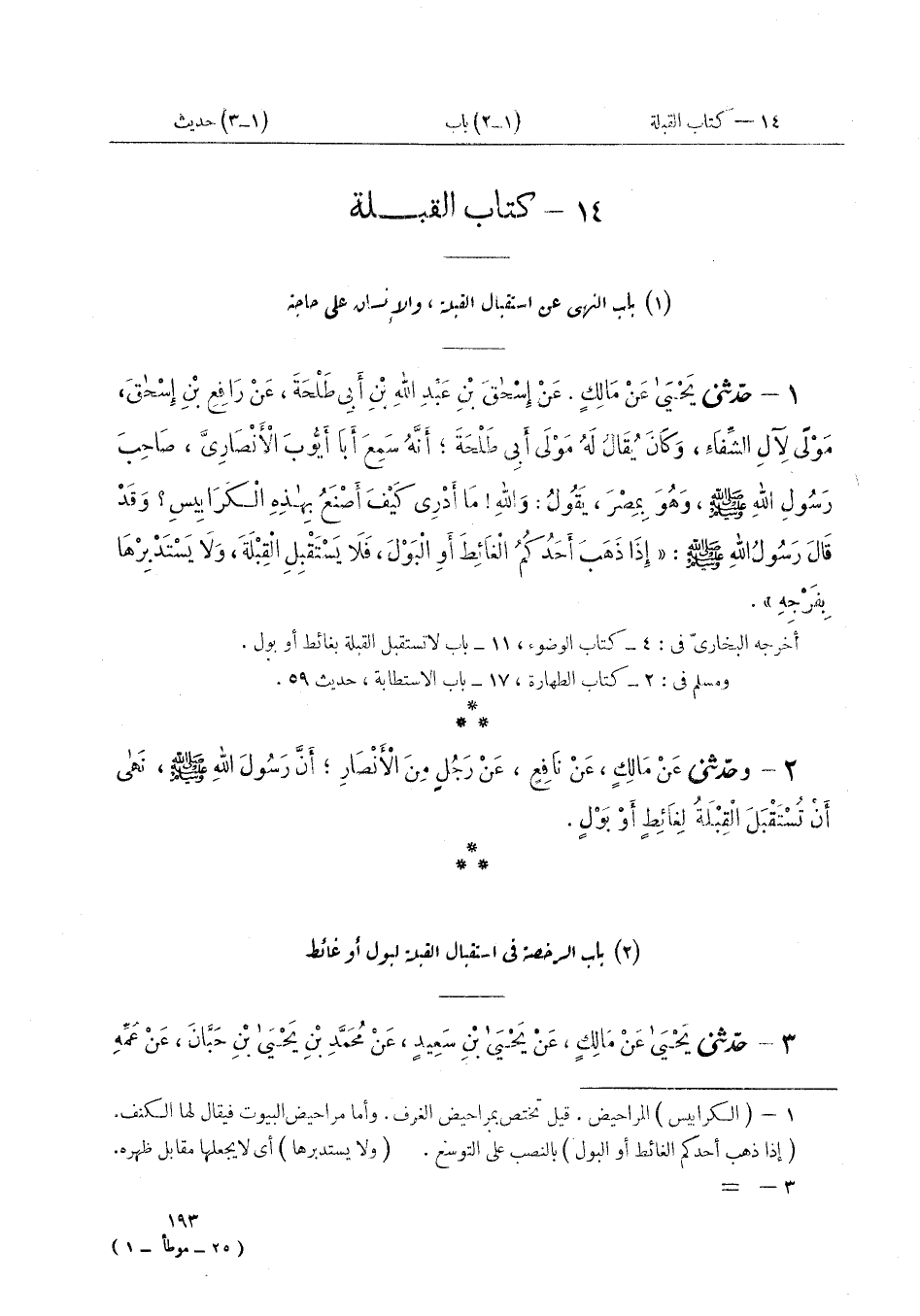 ١ - حَدَّثَنِي يَحْيَى، عَنْ مَالِكٍ، عَنْ إِسْحَقَ بْنِ عَبْدِ اللَّهِ بْنِ أَبِي طَلْحَةَ، عَنْ رَافِعِ بْنِ إِسْحَقَ، مَوْلًى لِآلِ الشِّفَاءِ، وَكَانَ يُقَالُ لَهُ: مَوْلَى أَبِي طَلْحَةَ أَنَّهُ سَمِعَ أَبَا أَيُّوبَ الْأَنْصَارِيَّ صَاحِبَ رَسُولِ اللَّهِ صَلَّى اللهُ عَلَيْهِ وَسَلَّمَ، وَهُوَ بِمِصْرَ يَقُولُ: وَاللَّهِ مَا أَدْرِي كَيْفَ أَصْنَعُ بِهَذِهِ الْكَرَابِيسِ؟ وَقَدْ قَالَ رَسُولُ اللَّهِ صَلَّى اللهُ عَلَيْهِ وَسَلَّمَ: «إِذَا ذَهَبَ أَحَدُكُمُ الْغَائِطَ أَوِ الْبَوْلَ، فَلَا يَسْتَقْبِلِ الْقِبْلَةَ، وَلَا يَسْتَدْبِرْهَا بِفَرْجِهِ»