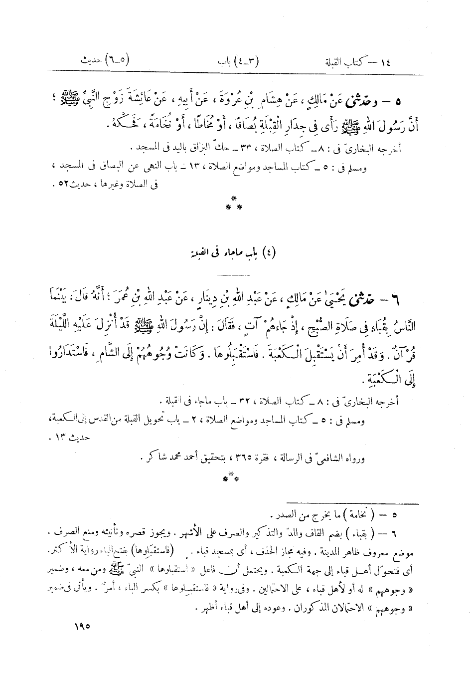 ٥ - وَحَدَّثَنِي عَنْ مَالِكٍ، عَنْ هِشَامِ بْنِ عُرْوَةَ، عَنْ أَبِيهِ، عَنْ عَائِشَةَ زَوْجِ النَّبِيِّ صَلَّى اللهُ عَلَيْهِ وَسَلَّمَ، أَنَّ رَسُولَ اللَّهِ صَلَّى اللهُ عَلَيْهِ وَسَلَّمَ «رَأَى فِي جِدَارِ الْقِبْلَةِ بُصَاقًا أَوْ مُخَاطًا أَوْ نُخَامَةً فَحَكَّهُ»