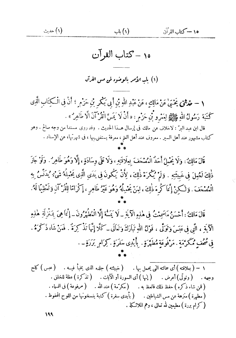 ١ - حَدَّثَنِي يَحْيَى، عَنْ مَالِكٍ، عَنْ عَبْدِ اللَّهِ بْنِ أَبِي بَكْرِ بْنِ حَزْمٍ، أَنَّ فِي الْكِتَابِ الَّذِي كَتَبَهُ رَسُولُ اللَّهِ صَلَّى اللهُ عَلَيْهِ وَسَلَّمَ لِعَمْرِو بْنِ حَزْمٍ: «أَنْ لَا يَمَسَّ الْقُرْآنَ إِلَّا طَاهِرٌ» قَالَ مَالِكٌ: «وَلَا يَحْمِلُ أَحَدٌ الْمُصْحَفَ بِعِلَاقَتِهِ وَلَا عَلَى وِسَادَةٍ إِلَّا وَهُوَ طَاهِرٌ، وَلَوْ جَازَ ذَلِكَ لَحُمِلَ فِي خَبِيئَتِهِ وَلَمْ يُكْرَهْ ذَلِكَ، لِأَنْ يَكُونَ فِي يَدَيِ الَّذِي يَحْمِلُهُ شَيْءٌ يُدَنِّسُ بِهِ الْمُصْحَفَ. وَلَكِنْ إِنَّمَا كُرِهَ ذَلِكَ لِمَنْ يَحْمِلُهُ وَهُوَ غَيْرُ طَاهِرٍ، إِكْرَامًا لِلْقُرْآنِ وَتَعْظِيمًا لَهُ» قَالَ مَالِكٌ: " أَحْسَنُ مَا سَمِعْتُ فِي هَذِهِ الْآيَةِ {لَا يَمَسُّهُ إِلَّا الْمُطَهَّرُونَ} [الواقعة: ٧٩] إِنَّمَا هِيَ بِمَنْزِلَةِ هَذِهِ الْآيَةِ، الَّتِي فِي {عَبَسَ وَتَوَلَّى} [عبس: ١]، قَوْلُ اللَّهِ تَبَارَكَ وَتَعَالَى: {كَلَّا إِنَّهَا تَذْكِرَةٌ. فَمَنْ شَاءَ ذَكَرَهُ. فِي صُحُفٍ مُكَرَّمَةٍ. مَرْفُوعَةٍ مُطَهَّرَةٍ. بِأَيْدِي سَفَرَةٍ. كِرَامٍ بَرَرَةٍ} [عبس: ١٢]
