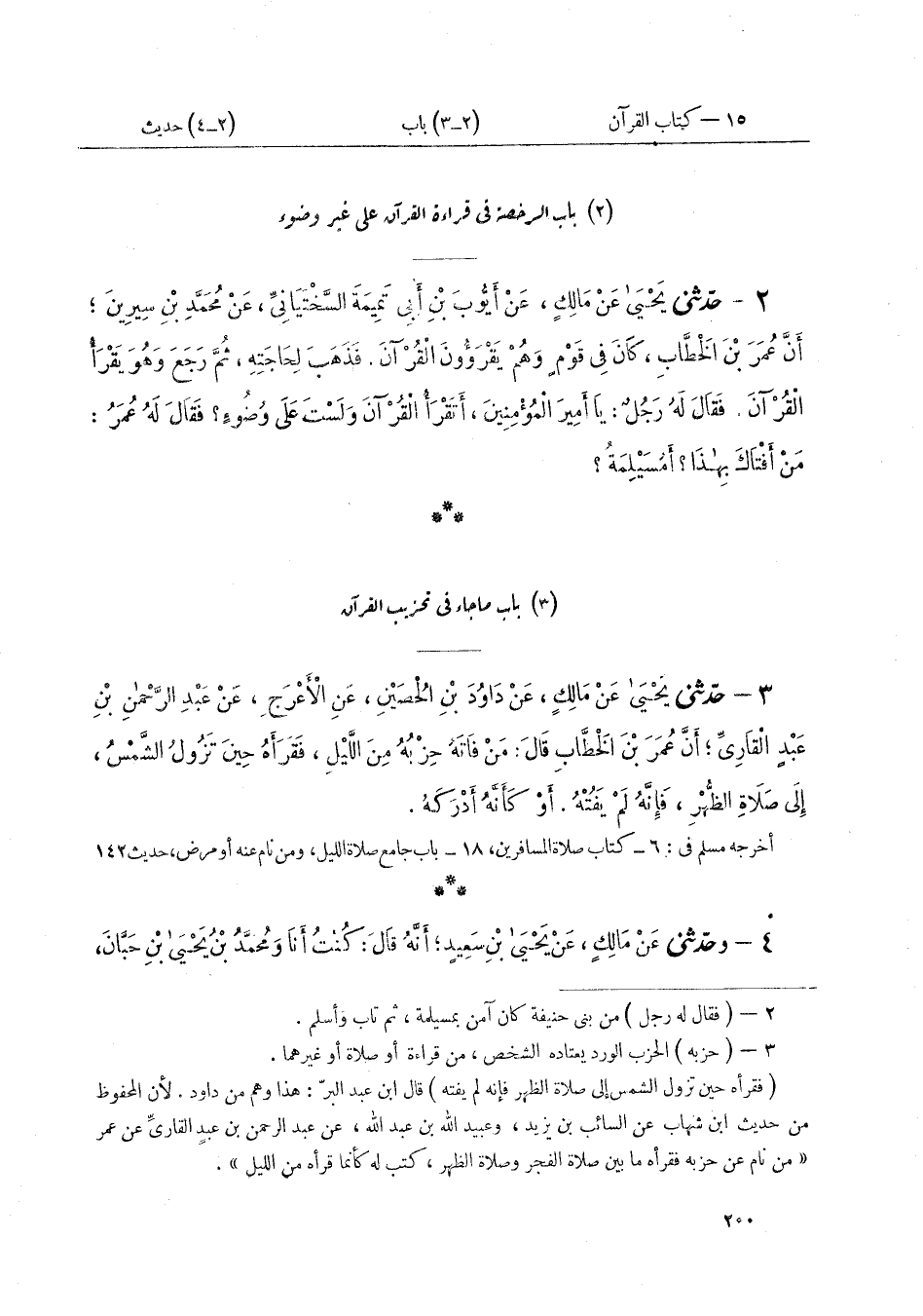 ٢ - حَدَّثَنِي يَحْيَى، عَنْ مَالِكٍ، عَنْ أَيُّوبَ بْنِ أَبِي تَمِيمَةَ السَّخْتِيَانِيِّ، عَنْ مُحَمَّدِ بْنِ سِيرِينَ، أَنَّ عُمَرَ بْنَ الْخَطَّابِ كَانَ فِي قَوْمٍ وَهُمْ يَقْرَءُونَ الْقُرْآنَ فَذَهَبَ لِحَاجَتِهِ، ثُمَّ رَجَعَ وَهُوَ يَقْرَأُ الْقُرْآنَ. فَقَالَ لَهُ رَجُلٌ: يَا أَمِيرَ الْمُؤْمِنِينَ، أَتَقْرَأُ الْقُرْآنَ وَلَسْتَ عَلَى وُضُوءٍ؟ فَقَالَ لَهُ عُمَرُ: «مَنْ أَفْتَاكَ بِهَذَا أَمُسَيْلِمَةُ»