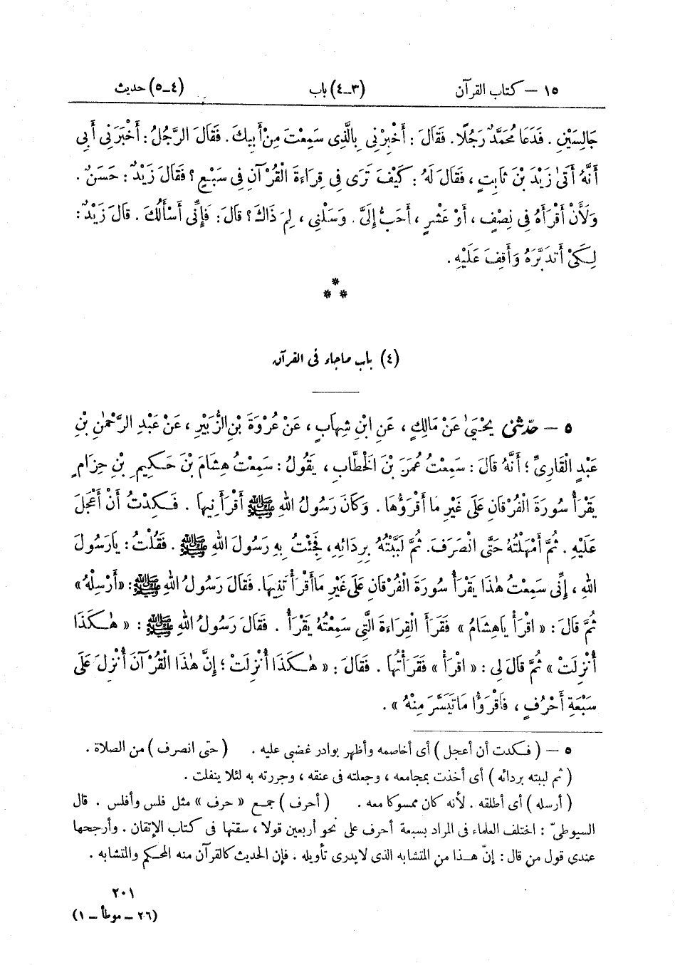 ٥ - حَدَّثَنِي يَحْيَى، عَنْ مَالِكٍ، عَنْ ابْنِ شِهَابٍ، عَنْ عُرْوَةَ بْنِ الزُّبَيْرِ، عَنْ عَبْدِ الرَّحْمَنِ بْنِ عَبْدٍ الْقَارِيِّ، أَنَّهُ قَالَ سَمِعْتُ عُمَرَ بْنَ الْخَطَّابِ، يَقُولُ: سَمِعْتُ هِشَامَ بْنَ حَكِيمِ بْنِ حِزَامٍ يَقْرَأُ سُورَةَ الْفُرْقَانِ عَلَى غَيْرِ مَا أَقْرَؤُهَا، وَكَانَ رَسُولُ اللَّهِ صَلَّى اللهُ عَلَيْهِ وَسَلَّمَ أَقْرَأَنِيهَا فَكِدْتُ أَنْ أَعْجَلَ عَلَيْهِ، ثُمَّ أَمْهَلْتُهُ حَتَّى انْصَرَفَ، ثُمَّ لَبَّبْتُهُ بِرِدَائِهِ، فَجِئْتُ بِهِ رَسُولَ اللَّهِ صَلَّى اللهُ عَلَيْهِ وَسَلَّمَ فَقُلْتُ: يَا رَسُولَ اللَّهِ، إِنِّي سَمِعْتُ هَذَا يَقْرَأُ سُورَةَ الْفُرْقَانِ عَلَى غَيْرِ مَا أَقْرَأْتَنِيهَا، فَقَالَ رَسُولُ اللَّهِ صَلَّى اللهُ عَلَيْهِ وَسَلَّمَ: «أَرْسِلْهُ»، ثُمَّ قَالَ: اقْرَأْ يَا هِشَامُ فَقَرَأَ الْقِرَاءَةَ الَّتِي سَمِعْتُهُ يَقْرَأُ. فَقَالَ رَسُولُ اللَّهِ صَلَّى اللهُ عَلَيْهِ وَسَلَّمَ: «هَكَذَا أُنْزِلَتْ»، ثُمَّ قَالَ لِي: اقْرَأْ فَقَرَأْتُهَا. فَقَالَ: «هَكَذَا أُنْزِلَتْ»، «إِنَّ هَذَا الْقُرْآنَ أُنْزِلَ عَلَى سَبْعَةِ أَحْرُفٍ فَاقْرَءُوا مَا تَيَسَّرَ مِنْهُ»