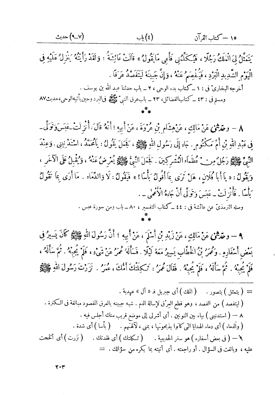 ٩ - وَحَدَّثَنِي عَنْ مَالِكٍ، عَنْ زَيْدِ بْنِ أَسْلَمَ، عَنْ أَبِيهِ، أَنَّ رَسُولَ اللَّهِ صَلَّى اللهُ عَلَيْهِ وَسَلَّمَ كَانَ يَسِيرُ فِي بَعْضِ أَسْفَارِهِ. وَعُمَرُ بْنُ الْخَطَّابِ يَسِيرُ مَعَهُ لَيْلًا، فَسَأَلَهُ عُمَرُ عَنْ شَيْءٍ، فَلَمْ يُجِبْهُ. ثُمَّ سَأَلَهُ، فَلَمْ يُجِبْهُ. ثُمَّ سَأَلَهُ، فَلَمْ يُجِبْهُ. فَقَالَ عُمَرُ: ثَكِلَتْكَ أُمُّكَ، عُمَرُ نَزَرْتَ رَسُولَ اللَّهِ صَلَّى اللهُ عَلَيْهِ وَسَلَّمَ ⦗٢٠٤⦘ ثَلَاثَ مَرَّاتٍ. كُلُّ ذَلِكَ لَا يُجِيبُكَ. قَالَ عُمَرُ فَحَرَّكْتُ بَعِيرِي. حَتَّى إِذَا كُنْتُ أَمَامَ النَّاسِ وَخَشِيتُ أَنْ يُنْزَلَ فِيَّ قُرْآنٌ. فَمَا نَشِبْتُ أَنْ سَمِعْتُ صَارِخًا يَصْرُخُ بِي قَالَ، فَقُلْتُ: لَقَدْ خَشِيتُ أَنْ يَكُونَ نَزَلَ فِيَّ قُرْآنٌ، قَالَ: فَجِئْتُ رَسُولَ اللَّهِ صَلَّى اللهُ عَلَيْهِ وَسَلَّمَ فَسَلَّمْتُ عَلَيْهِ. فَقَالَ: «لَقَدْ أُنْزِلَتْ عَلَيَّ، هَذِهِ اللَّيْلَةَ، سُورَةٌ. لَهِيَ أَحَبُّ إِلَيَّ مِمَّا طَلَعَتْ عَلَيْهِ الشَّمْسُ»، ثُمَّ قَرَأَ: " {إِنَّا فَتَحْنَا لَكَ فَتْحًا مُبِينًا} [الفتح: ١] "