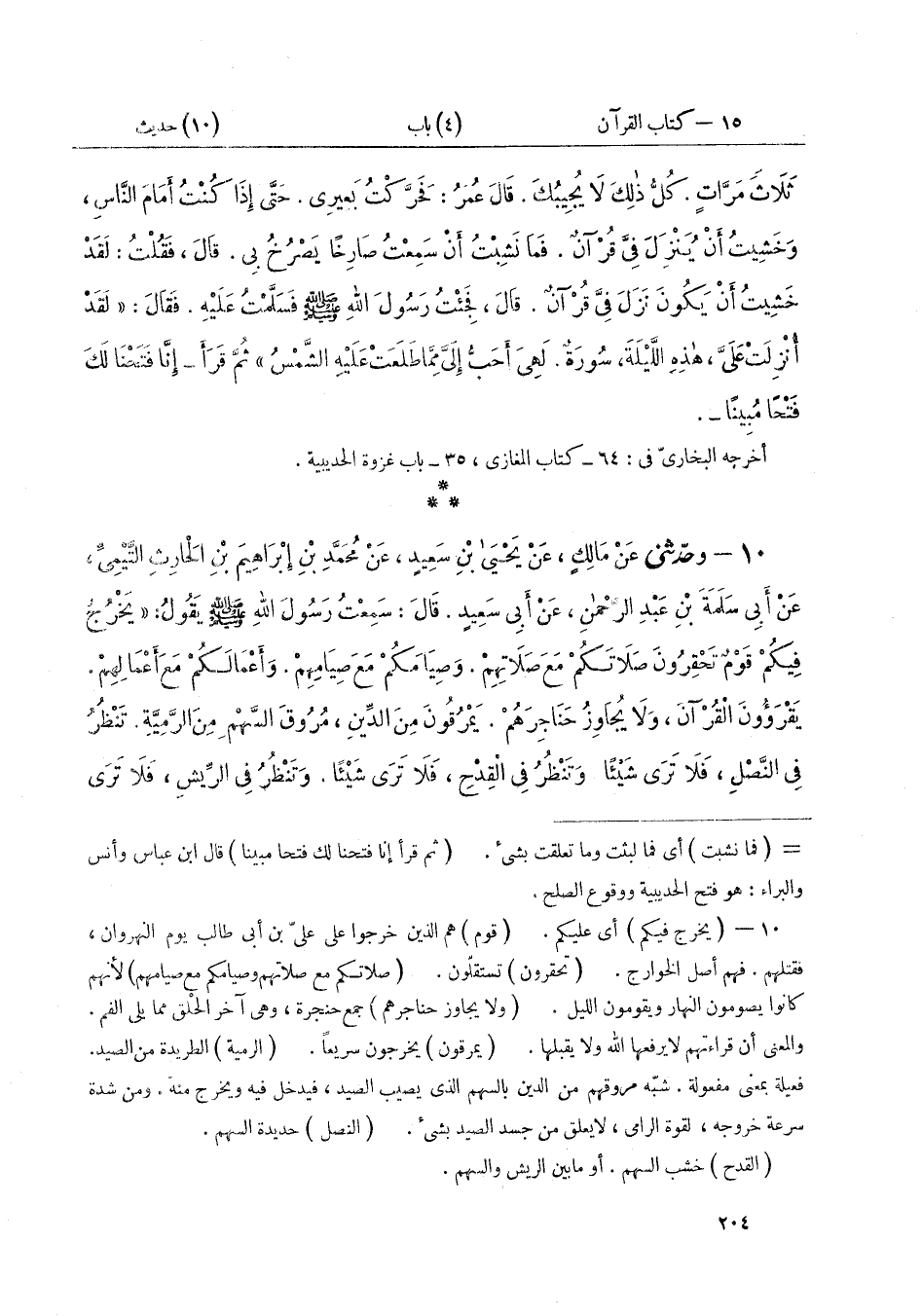 ١٠ - وَحَدَّثَنِي عَنْ مَالِكٍ، عَنْ يَحْيَى بْنِ سَعِيدٍ، عَنْ مُحَمَّدِ بْنِ إِبْرَاهِيمَ بْنِ الْحَارِثِ التَّيْمِيِّ، عَنْ أَبِي سَلَمَةَ بْنِ عَبْدِ الرَّحْمَنِ، عَنْ أَبِي سَعِيدٍ قَالَ: سَمِعْتُ رَسُولَ اللَّهِ صَلَّى اللهُ عَلَيْهِ وَسَلَّمَ، يَقُولُ: " يَخْرُجُ فِيكُمْ قَوْمٌ تَحْقِرُونَ صَلَاتَكُمْ مَعَ صَلَاتِهِمْ، وَصِيَامَكُمْ مَعَ صِيَامِهِمْ، وَأَعْمَالَكُمْ مَعَ أَعْمَالِهِمْ، يَقْرَءُونَ الْقُرْآنَ، وَلَا يُجَاوِزُ حَنَاجِرَهُمْ يَمْرُقُونَ مِنَ الدِّينِ مُرُوقَ السَّهْمِ مِنَ الرَّمِيَّةِ، تَنْظُرُ فِي النَّصْلِ، فَلَا تَرَى ⦗٢٠٥⦘ شَيْئًا، وَتَنْظُرُ فِي الْقِدْحِ فَلَا تَرَى شَيْئًا، وَتَنْظُرُ فِي الرِّيشِ، فَلَا تَرَى شَيْئًا، وَتَتَمَارَى فِي الْفُوقِ