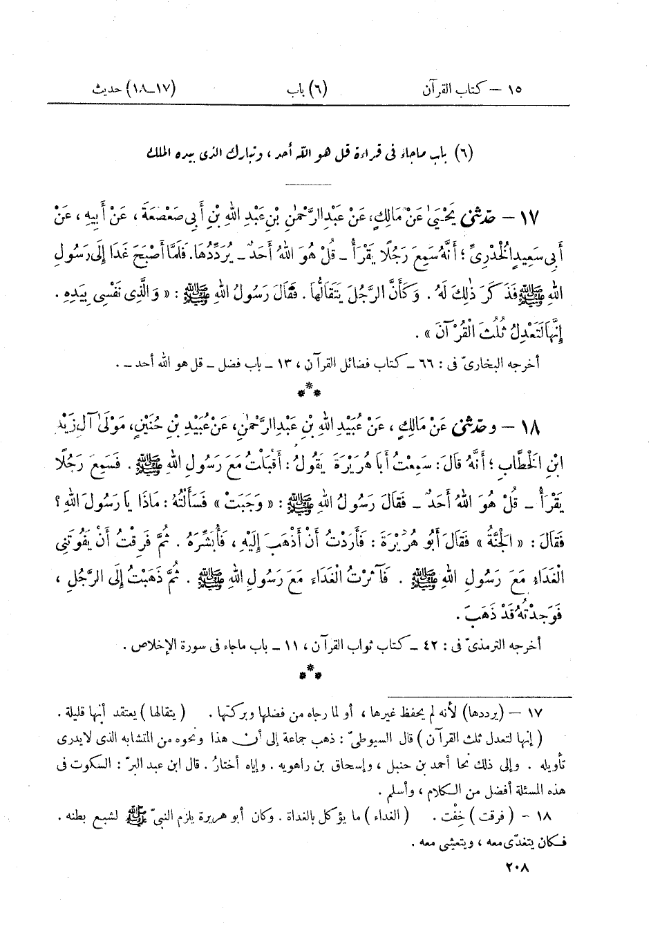 ١٧ - حَدَّثَنِي يَحْيَى، عَنْ مَالِكٍ، عَنْ عَبْدِ الرَّحْمَنِ بْنِ عَبْدِ اللَّهِ بْنِ أَبِي صَعْصَعَةَ، عَنْ أَبِيهِ، عَنْ أَبِي سَعِيدٍ الْخُدْرِيِّ، أَنَّهُ سَمِعَ رَجُلًا يَقْرَأُ: قُلْ هُوَ اللَّهُ أَحَدٌ يُرَدِّدُهَا. فَلَمَّا أَصْبَحَ غَدَا إِلَى رَسُولِ اللَّهِ صَلَّى اللهُ عَلَيْهِ وَسَلَّمَ فَذَكَرَ ذَلِكَ لَهُ. وَكَأَنَّ الرَّجُلَ يَتَقَالُّهَا فَقَالَ رَسُولُ اللَّهِ صَلَّى اللهُ عَلَيْهِ وَسَلَّمَ: «وَالَّذِي نَفْسِي بِيَدِهِ إِنَّهَا لَتَعْدِلُ ثُلُثَ الْقُرْآنِ»