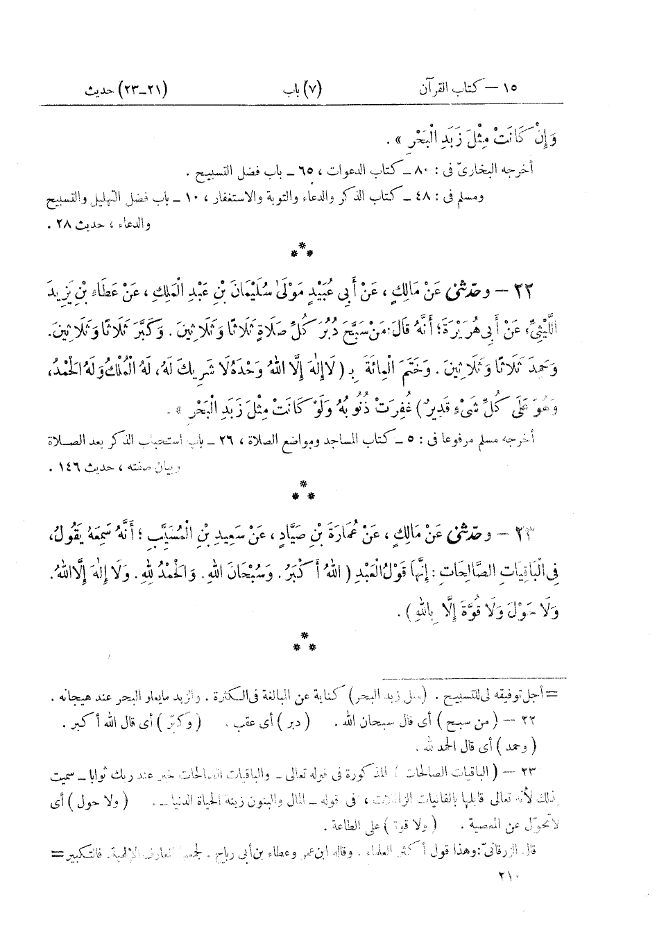 ٢٢ - وَحَدَّثَنِي عَنْ مَالِكٍ، عَنْ أَبِي عُبَيْدٍ مَوْلَى سُلَيْمَانَ بْنِ عَبْدِ الْمَلِكِ، عَنْ عَطَاءِ بْنِ يَزِيدَ اللَّيْثِيِّ، عَنْ أَبِي هُرَيْرَةَ، أَنَّهُ قَالَ: «مَنْ سَبَّحَ دُبُرَ كُلِّ صَلَاةٍ ثَلَاثًا وَثَلَاثِينَ، وَكَبَّرَ ثَلَاثًا وَثَلَاثِينَ، وَحَمِدَ ثَلَاثًا وَثَلَاثِينَ، وَخَتَمَ الْمِائَةَ بِلَا إِلَهَ إِلَّا اللَّهُ، وَحْدَهُ لَا شَرِيكَ لَهُ، لَهُ الْمُلْكُ وَلَهُ الْحَمْدُ وَهُوَ عَلَى كُلِّ شَيْءٍ قَدِيرٌ، غُفِرَتْ ذُنُوبُهُ وَلَوْ كَانَتْ مِثْلَ زَبَدِ الْبَحْرِ»