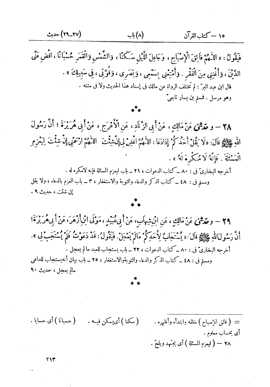 ٢٨ - وَحَدَّثَنِي عَنْ مَالِكٍ، عَنْ أَبِي الزِّنَادِ، عَنِ الْأَعْرَجِ، عَنْ أَبِي هُرَيْرَةَ أَنَّ رَسُولَ اللَّهِ صَلَّى اللهُ عَلَيْهِ وَسَلَّمَ قَالَ: " لَا يَقُلْ أَحَدُكُمْ إِذَا دَعَا: اللَّهُمَّ اغْفِرْ لِي إِنْ شِئْتَ. اللَّهُمَّ ارْحَمْنِي إِنْ شِئْتَ. لِيَعْزِمِ الْمَسْأَلَةَ فَإِنَّهُ لَا مُكْرِهَ لَهُ "