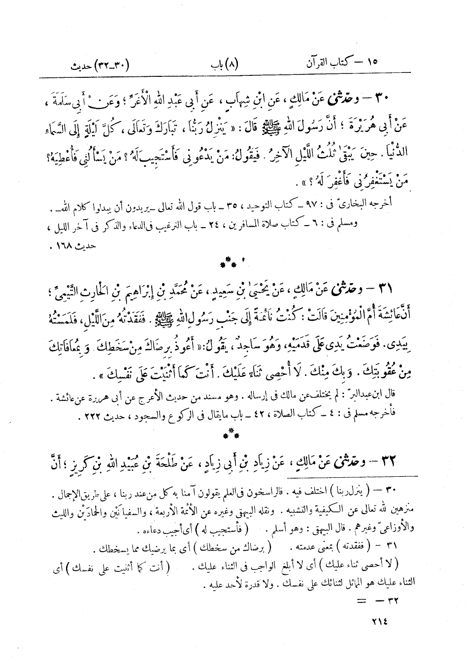 ٣١ - وَحَدَّثَنِي عَنْ مالِكٍ، عَنْ يَحْيَى بْنِ سَعِيدٍ، عَنْ مُحَمَّدِ بْنِ إِبْرَاهِيمَ بْنِ الْحَارِثِ التَّيْمِيِّ، أَنَّ عَائِشَةَ أُمَّ الْمُؤْمِنِينَ قَالَتْ: كُنْتُ نَائِمَةً إِلَى جَنْبِ رَسُولِ اللَّهِ صَلَّى اللهُ عَلَيْهِ وَسَلَّمَ. فَفَقَدْتُهُ مِنَ اللَّيْلِ، فَلَمَسْتُهُ بِيَدِي، فَوَضَعْتُ يَدِي عَلَى قَدَمَيْهِ، وَهُوَ سَاجِدٌ، يَقُولُ: «أَعُوذُ بِرِضَاكَ مِنْ سَخَطِكَ، وَبِمُعَافَاتِكَ مِنْ عُقُوبَتِكَ، وَبِكَ مِنْكَ لَا أُحْصِي ثَنَاءً عَلَيْكَ، أَنْتَ كَمَا أَثْنَيْتَ عَلَى نَفْسِكَ»
