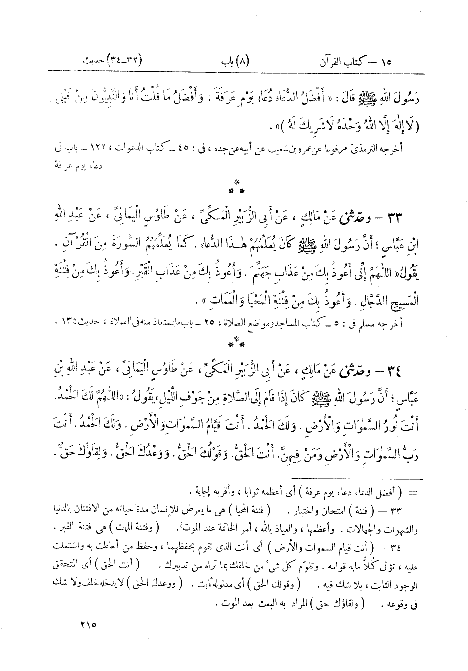 ٣٤ - وَحَدَّثَنِي عَنْ مالِكٍ، عَنْ أَبِي الزُّبَيْرِ الْمَكِّيِّ، عَنْ طَاوُسٍ الْيَمَانِيِّ، عَنْ عَبْدِ اللَّهِ بْنِ عَبَّاسٍ أَنَّ رَسُولَ اللَّهِ صَلَّى اللهُ عَلَيْهِ وَسَلَّمَ كَانَ إِذَا قَامَ إِلَى الصَّلَاةِ مِنْ جَوْفِ اللَّيْلِ، يَقُولُ: «اللَّهُمَّ لَكَ الْحَمْدُ. أَنْتَ نُورُ السَّمَوَاتِ وَالْأَرْضِ. وَلَكَ الْحَمْدُ. أَنْتَ قَيَّامُ السَّمَوَاتِ وَالْأَرْضِ، وَلَكَ الْحَمْدُ. أَنْتَ رَبُّ السَّمَوَاتِ وَالْأَرْضِ وَمَنْ فِيهِنَّ، أَنْتَ الْحَقُّ، وَقَوْلُكَ الْحَقُّ، وَوَعْدُكَ الْحَقُّ، وَلِقَاؤُكَ حَقٌّ، ⦗٢١٦⦘ وَالْجَنَّةُ حَقٌّ، وَالنَّارُ حَقٌّ، وَالسَّاعَةُ حَقٌّ، اللَّهُمَّ لَكَ أَسْلَمْتُ، وَبِكَ آمَنْتُ، وَعَلَيْكَ تَوَكَّلْتُ، وَإِلَيْكَ أَنَبْتُ، وَبِكَ خَاصَمْتُ، وَإِلَيْكَ حَاكَمْتُ. فَاغْفِرْ لِي مَا قَدَّمْتُ وَأَخَّرْتُ. وَأَسْرَرْتُ وَأَعْلَنْتُ. أَنْتَ إِلَهِي لَا إِلَهَ إِلَّا أَنْتَ»