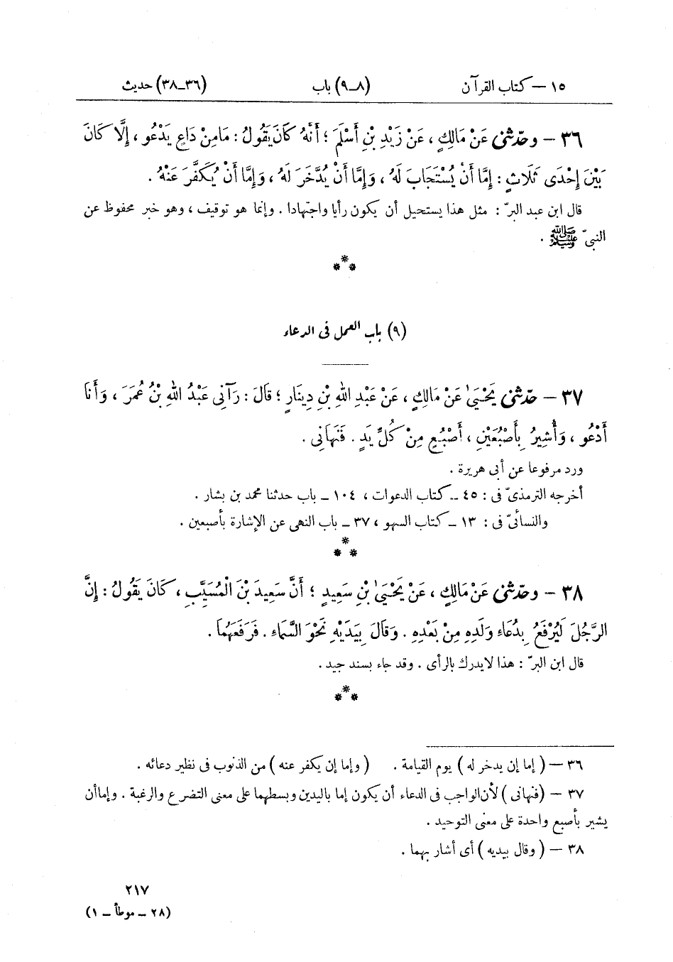٣٦ - وَحَدَّثَنِي عَنْ مالِكٍ عَنْ زَيْدِ بْنِ أَسْلَمَ أَنَّهُ كَانَ يَقُولُ: " مَا مِنْ دَاعٍ يَدْعُو، إِلَّا كَانَ بَيْنَ إِحْدَى ثَلَاثٍ: إِمَّا أَنْ يُسْتَجَابَ لَهُ، وَإِمَّا أَنْ يُدَّخَرَ لَهُ، وَإِمَّا أَنْ يُكَفَّرَ عَنْهُ "