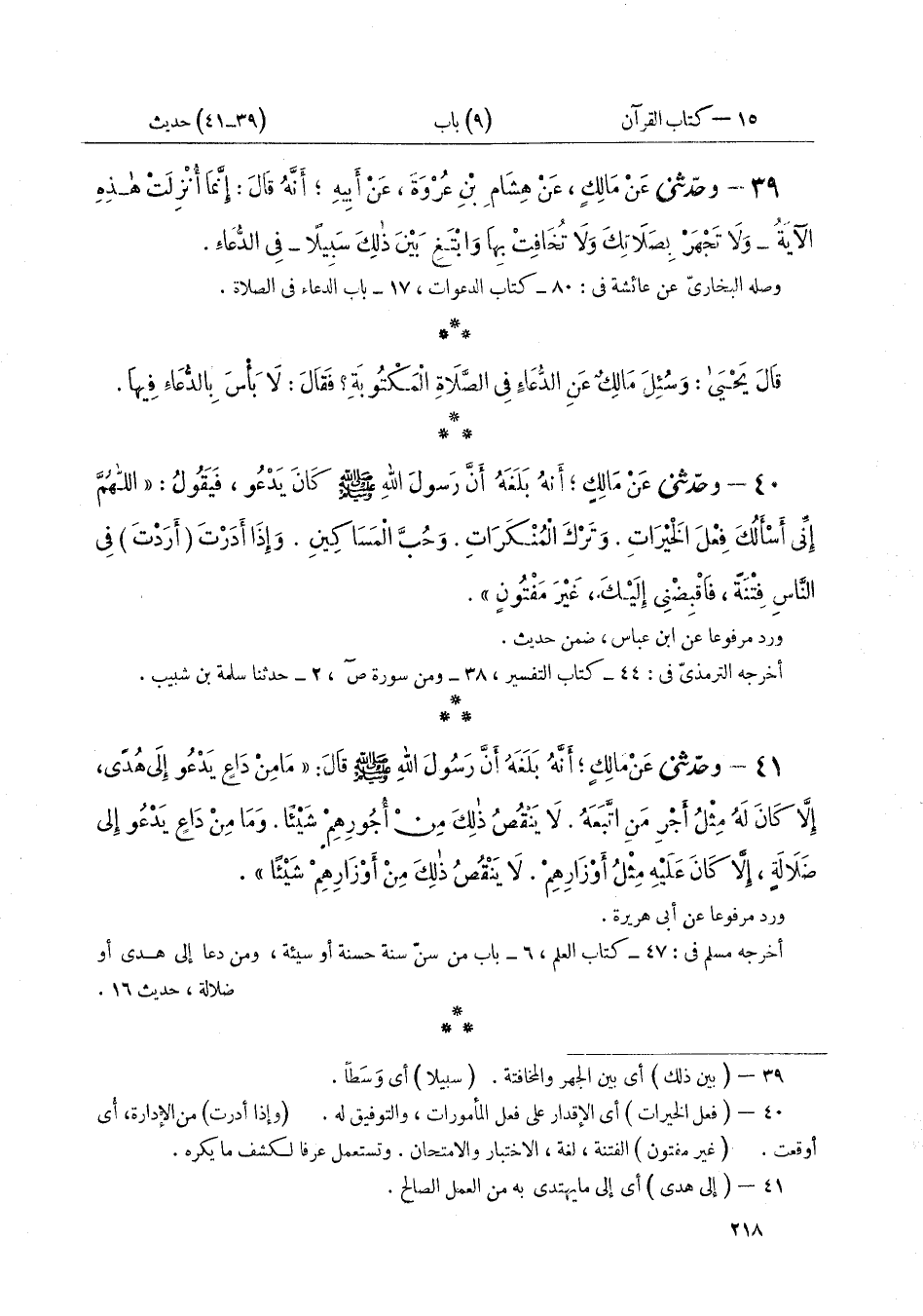 ٤١ - وَحَدَّثَنِي عَنْ مَالِكٍ أَنَّهُ بَلَغَهُ، أَنَّ رَسُولَ اللَّهِ صَلَّى اللهُ عَلَيْهِ وَسَلَّمَ قَالَ: «مَا مِنْ دَاعٍ يَدْعُو إِلَى هُدًى، إِلَّا كَانَ لَهُ مِثْلُ أَجْرِ مَنِ اتَّبَعَهُ. لَا يَنْقُصُ ذَلِكَ مِنْ أُجُورِهِمْ شَيْئًا. وَمَا مِنْ دَاعٍ يَدْعُو إِلَى ضَلَالَةٍ، إِلَّا كَانَ عَلَيْهِ مِثْلُ أَوْزَارِهِمْ. لَا يَنْقُصُ ذَلِكَ مِنْ أَوْزَارِهِمْ شَيْئًا»