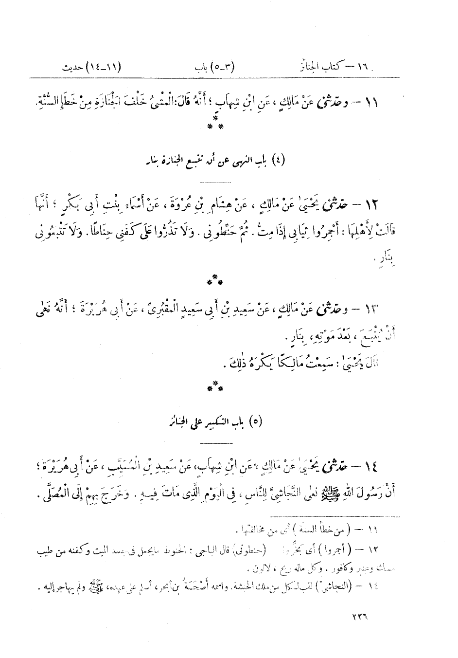 ١٤ - حَدَّثَنِي يَحْيَى، عَنْ مَالِكٍ، عَنْ ابْنِ شِهَابٍ، عَنْ سَعِيدِ بْنِ الْمُسَيِّبِ، عَنْ أَبِي هُرَيْرَةَ، أَنَّ رَسُولَ اللَّهِ صَلَّى اللهُ عَلَيْهِ وَسَلَّمَ: «نَعَى النَّجَاشِيَّ لِلنَّاسِ فِي الْيَوْمِ الَّذِي مَاتَ فِيهِ، وَخَرَجَ بِهِمْ إِلَى الْمُصَلَّى، ⦗٢٢٧⦘ فَصَفَّ بِهِمْ وَكَبَّرَ أَرْبَعَ تَكْبِيرَاتٍ»