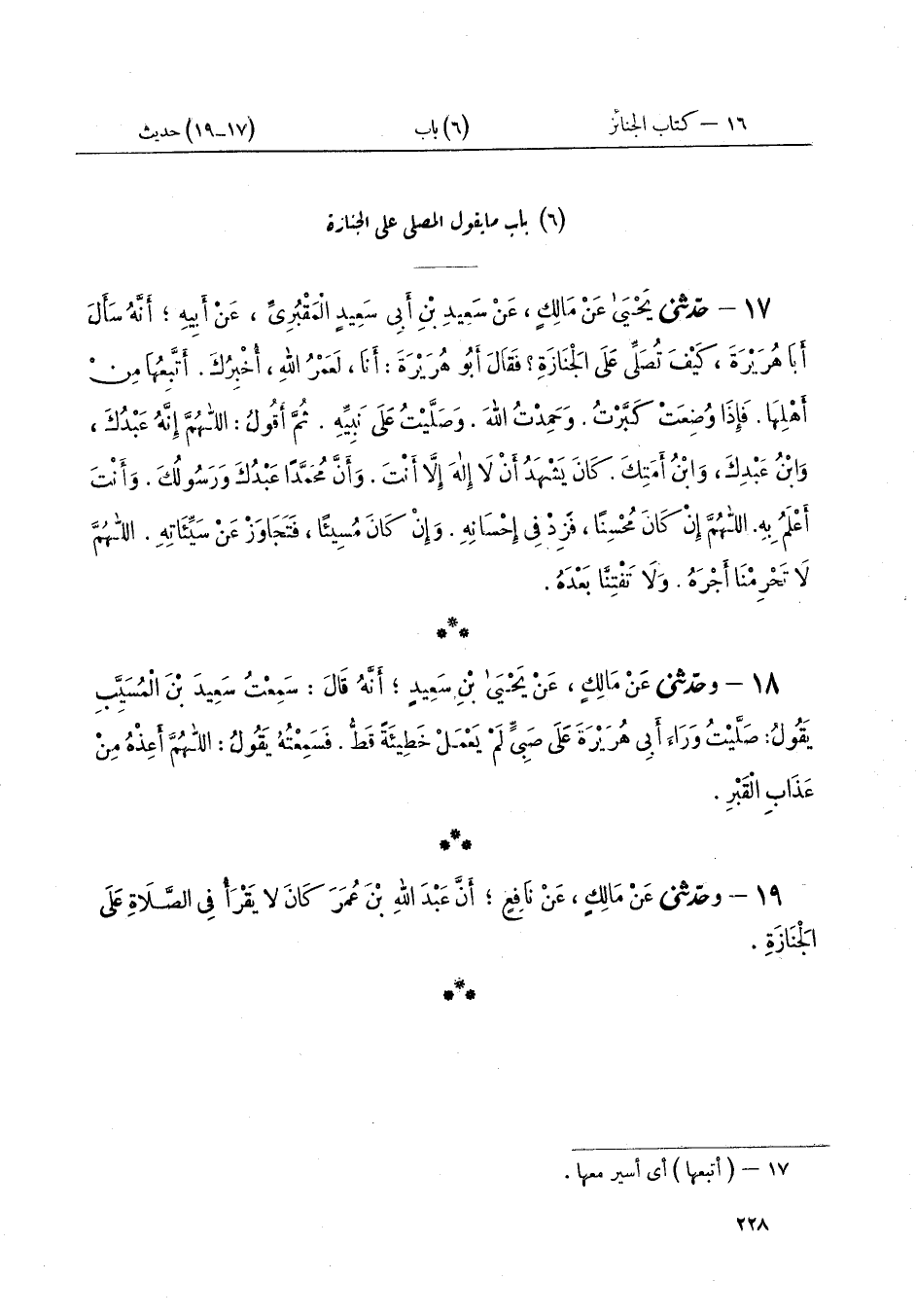 ١٧ - حَدَّثَنِي يَحْيَى، عَنْ مَالِكٍ، عَنْ سَعِيدِ بْنِ أَبِي سَعِيدٍ الْمَقْبُرِيِّ، عَنْ أَبِيهِ أَنَّهُ سَأَلَ أَبَا هُرَيْرَةَ كَيْفَ تُصَلِّي عَلَى الْجَنَازَةِ؟ فَقَالَ أَبُو هُرَيْرَةَ: «أَنَا، لَعَمْرُ اللَّهِ أُخْبِرُكَ. أَتَّبِعُهَا مِنْ أَهْلِهَا. فَإِذَا وُضِعَتْ كَبَّرْتُ، وَحَمِدْتُ اللَّهَ. وَصَلَّيْتُ عَلَى نَبِيِّهِ». ثُمَّ أَقُولُ: «اللَّهُمَّ إِنَّهُ عَبْدُكَ وَابْنُ عَبْدِكَ وَابْنُ أَمَتِكَ كَانَ يَشْهَدُ أَنْ لَا إِلَهَ إِلَّا أَنْتَ. وَأَنَّ مُحَمَّدًا عَبْدُكَ وَرَسُولُكَ. وَأَنْتَ أَعْلَمُ بِهِ. اللَّهُمَّ إِنْ كَانَ مُحْسِنًا، فَزِدْ فِي إِحْسَانِهِ. وَإِنْ كَانَ مُسِيئًا، فَتَجَاوَزْ عَنْ سَيِّئَاتِهِ. اللَّهُمَّ لَا تَحْرِمْنَا أَجْرَهُ، وَلَا تَفْتِنَّا بَعْدَهُ»