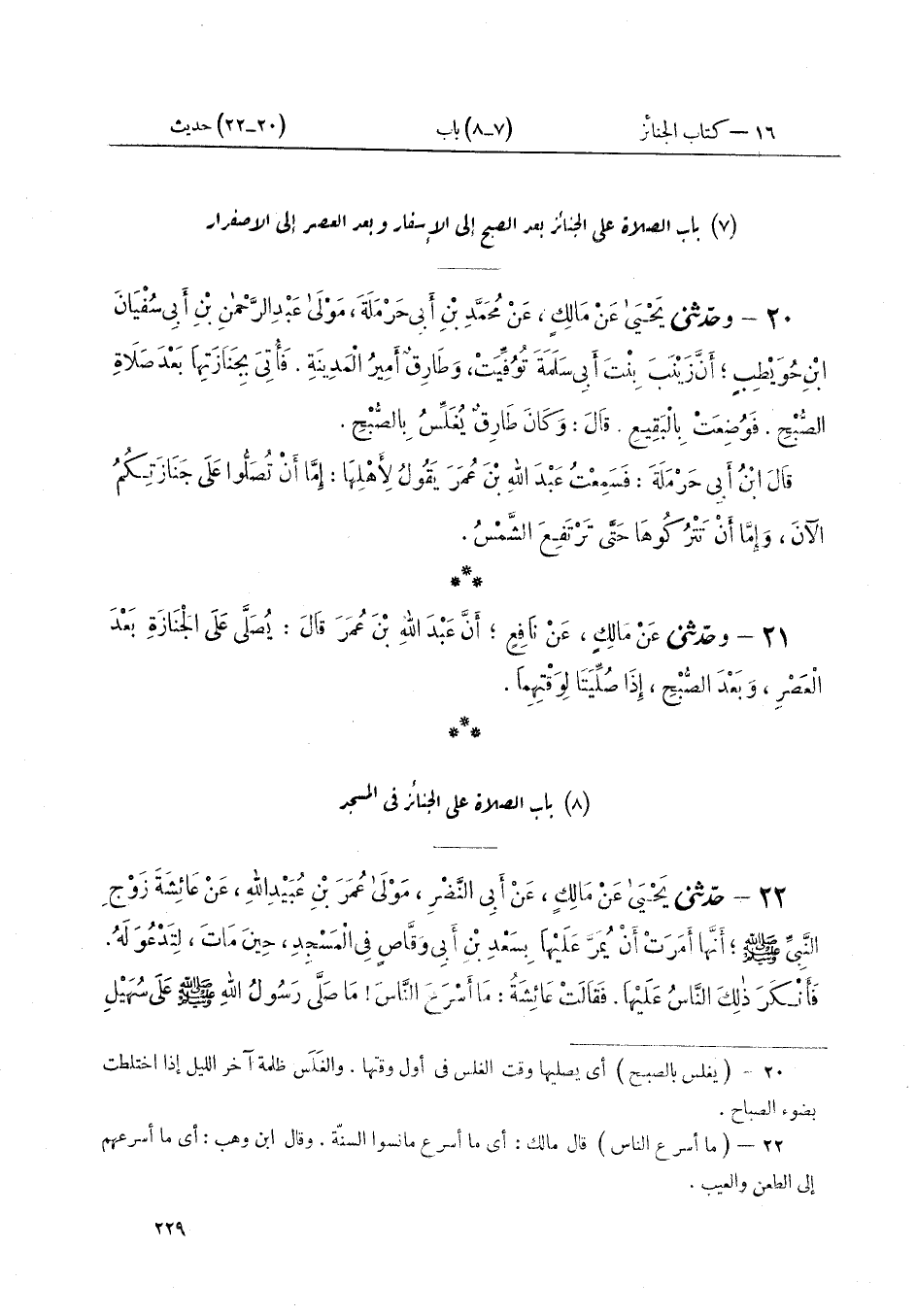 ٢٢ - حَدَّثَنِي يَحْيَى، عَنْ مَالِكٍ، عَنْ أَبِي النَّضْرِ مَوْلَى عُمَرَ بْنِ عُبَيْدِ اللَّهِ، عَنْ عَائِشَةَ زَوْجِ النَّبِيِّ صَلَّى اللهُ عَلَيْهِ وَسَلَّمَ، أَنَّهَا أَمَرَتْ أَنْ يُمَرَّ عَلَيْهَا بِسَعْدِ بْنِ أَبِي وَقَّاصٍ فِي الْمَسْجِدِ، حِينَ مَاتَ، لِتَدْعُوَ لَهُ. فَأَنْكَرَ ذَلِكَ النَّاسُ عَلَيْهَا. فَقَالَتْ عَائِشَةُ: «مَا أَسْرَعَ النَّاسَ مَا صَلَّى رَسُولُ اللَّهِ صَلَّى اللهُ عَلَيْهِ وَسَلَّمَ عَلَى سُهَيْلِ ⦗٢٣٠⦘ بْنِ بَيْضَاءَ إِلَّا فِي الْمَسْجِدِ»