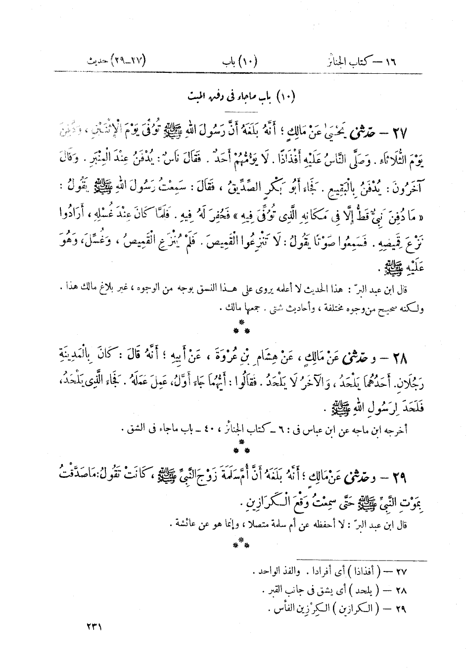 ٢٧ - حَدَّثَنِي يَحْيَى، عَنْ مَالِكٍ أَنَّهُ بَلَغَهُ أَنَّ رَسُولَ اللَّهِ صَلَّى اللهُ عَلَيْهِ وَسَلَّمَ «تُوُفِّيَ يَوْمَ الْإِثْنَيْنِ، وَدُفِنَ يَوْمَ الثُّلَاثَاءِ، وَصَلَّى النَّاسُ عَلَيْهِ أَفْذَاذًا لَا يَؤُمُّهُمْ أَحَدٌ». فَقَالَ نَاسٌ: يُدْفَنُ عِنْدَ الْمِنْبَرِ، وَقَالَ آخَرُونَ: يُدْفَنُ بِالْبَقِيعِ، فَجَاءَ أَبُو بَكْرٍ الصِّدِّيقُ، فَقَالَ: سَمِعْتُ رَسُولَ اللَّهِ صَلَّى اللهُ عَلَيْهِ وَسَلَّمَ يَقُولُ: «مَا دُفِنَ نَبِيٌّ قَطُّ إِلَّا فِي مَكَانِهِ الَّذِي تُوُفِّيَ فِيهِ»، فَحُفِرَ لَهُ فِيهِ، فَلَمَّا كَانَ عِنْدَ غُسْلِهِ، أَرَادُوا نَزْعَ قَمِيصِهِ. فَسَمِعُوا صَوْتًا يَقُولُ: «لَا تَنْزِعُوا الْقَمِيصَ»، فَلَمْ يُنْزَعِ الْقَمِيصُ، «وَغُسِّلَ وَهُوَ عَلَيْهِ صَلَّى اللهُ عَلَيْهِ وَسَلَّمَ»