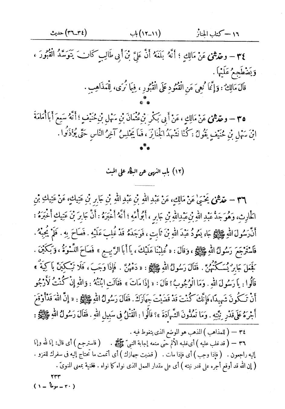 ٣٤ - وَحَدَّثَنِي عَنْ مَالِكٍ أَنَّهُ بَلَغَهُ، أَنَّ عَلِيَّ بْنَ أَبِي طَالِبٍ كَانَ «يَتَوَسَّدُ الْقُبُورَ، وَيَضْطَجِعُ عَلَيْهَا» قَالَ مَالِكٌ: «وَإِنَّمَا نُهِيَ عَنِ الْقُعُودِ عَلَى الْقُبُورِ - فِيمَا نَرَى - لِلْمَذَاهِبِ»