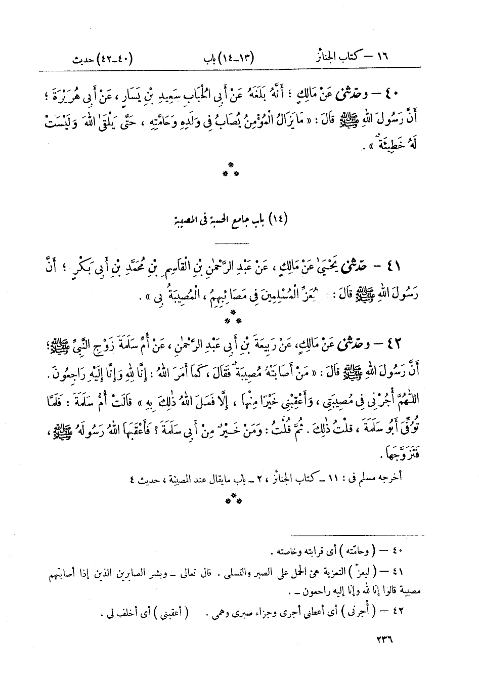٤٢ - وَحَدَّثَنِي عَنْ مَالِكٍ، عَنْ رَبِيعَةَ بْنِ أَبِي عَبْدِ الرَّحْمَنِ، عَنْ أُمِّ سَلَمَةَ زَوْجِ النَّبِيِّ صَلَّى اللهُ عَلَيْهِ وَسَلَّمَ، أَنَّ رَسُولَ اللَّهِ صَلَّى اللهُ عَلَيْهِ وَسَلَّمَ قَالَ: " مَنْ أَصَابَتْهُ مُصِيبَةٌ فَقَالَ كَمَا أَمَرَ اللَّهُ {إِنَّا لِلَّهِ وَإِنَّا إِلَيْهِ رَاجِعُونَ} [البقرة: ١٥٦]، اللَّهُمَّ أْجُرْنِي فِي مُصِيبَتِي، وَأَعْقِبْنِي خَيْرًا مِنْهَا، إِلَّا فَعَلَ اللَّهُ ذَلِكَ بِهِ " قَالَتْ أُمُّ سَلَمَةَ: فَلَمَّا تُوُفِّيَ أَبُو سَلَمَةَ، قُلْتُ ذَلِكَ. ثُمَّ قُلْتُ: وَمَنْ خَيْرٌ مِنْ أَبِي سَلَمَةَ فَأَعْقَبَهَا اللَّهُ رَسُولَهُ صَلَّى اللهُ عَلَيْهِ وَسَلَّمَ فَتَزَوَّجَهَا