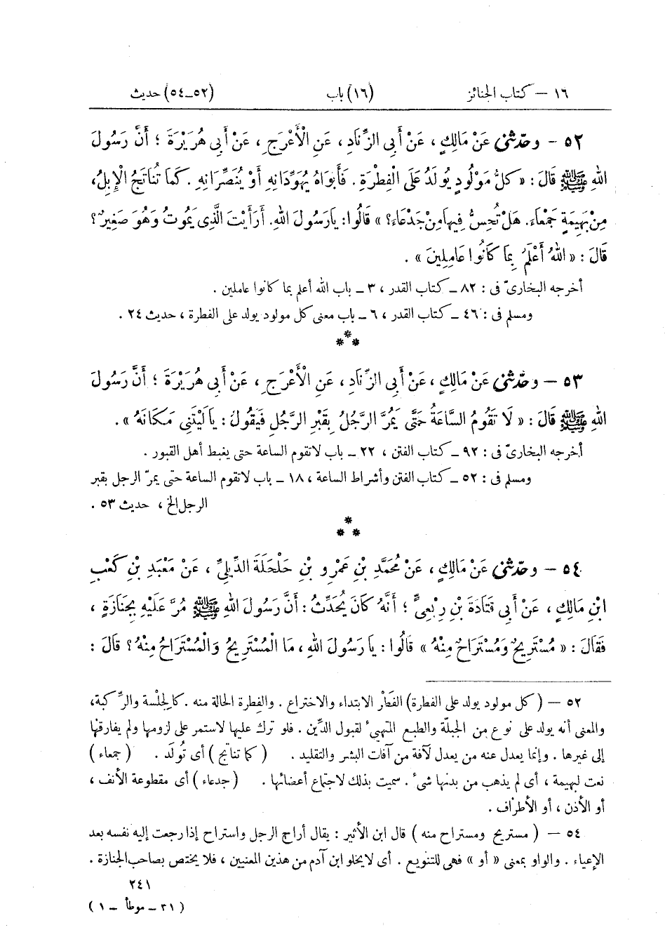 ٥٢ - وَحَدَّثَنِي عَنْ مَالِكٍ، عَنْ أَبِي الزِّنَادِ، عَنِ الْأَعْرَجِ، عَنْ أَبِي هُرَيْرَةَ، أَنَّ رَسُولَ اللَّهِ صَلَّى اللهُ عَلَيْهِ وَسَلَّمَ قَالَ: «كُلُّ مَوْلُودٍ يُولَدُ عَلَى الْفِطْرَةِ، فَأَبَوَاهُ يُهَوِّدَانِهِ أَوْ يُنَصِّرَانِهِ كَمَا تُنَاتَجُ الْإِبِلُ مِنْ بَهِيمَةٍ جَمْعَاءَ، هَلْ تُحِسُّ فِيهَا مِنْ جَدْعَاءَ؟» قَالُوا: يَا رَسُولَ اللَّهِ أَرَأَيْتَ الَّذِي يَمُوتُ وَهُوَ صَغِيرٌ؟ قَالَ: «اللَّهُ أَعْلَمُ بِمَا كَانُوا عَامِلِينَ»