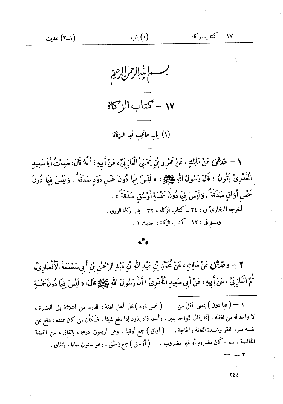 ١ - حَدَّثَنِي عَنْ مَالِكٍ، عَنْ عَمْرِو بْنِ يَحْيَى الْمَازِنِيِّ، عَنْ أَبِيهِ، أَنَّهُ قَالَ: سَمِعْتُ أَبَا سَعِيدٍ الْخُدْرِيَّ يَقُولُ: قَالَ رَسُولُ اللَّهِ صَلَّى اللهُ عَلَيْهِ وَسَلَّمَ: «لَيْسَ فِيمَا دُونَ خَمْسِ ذَوْدٍ صَدَقَةٌ، وَلَيْسَ فِيمَا دُونَ خَمْسِ أَوَاقٍ صَدَقَةٌ، وَلَيْسَ فِيمَا دُونَ خَمْسَةِ أَوْسُقٍ صَدَقَةٌ»