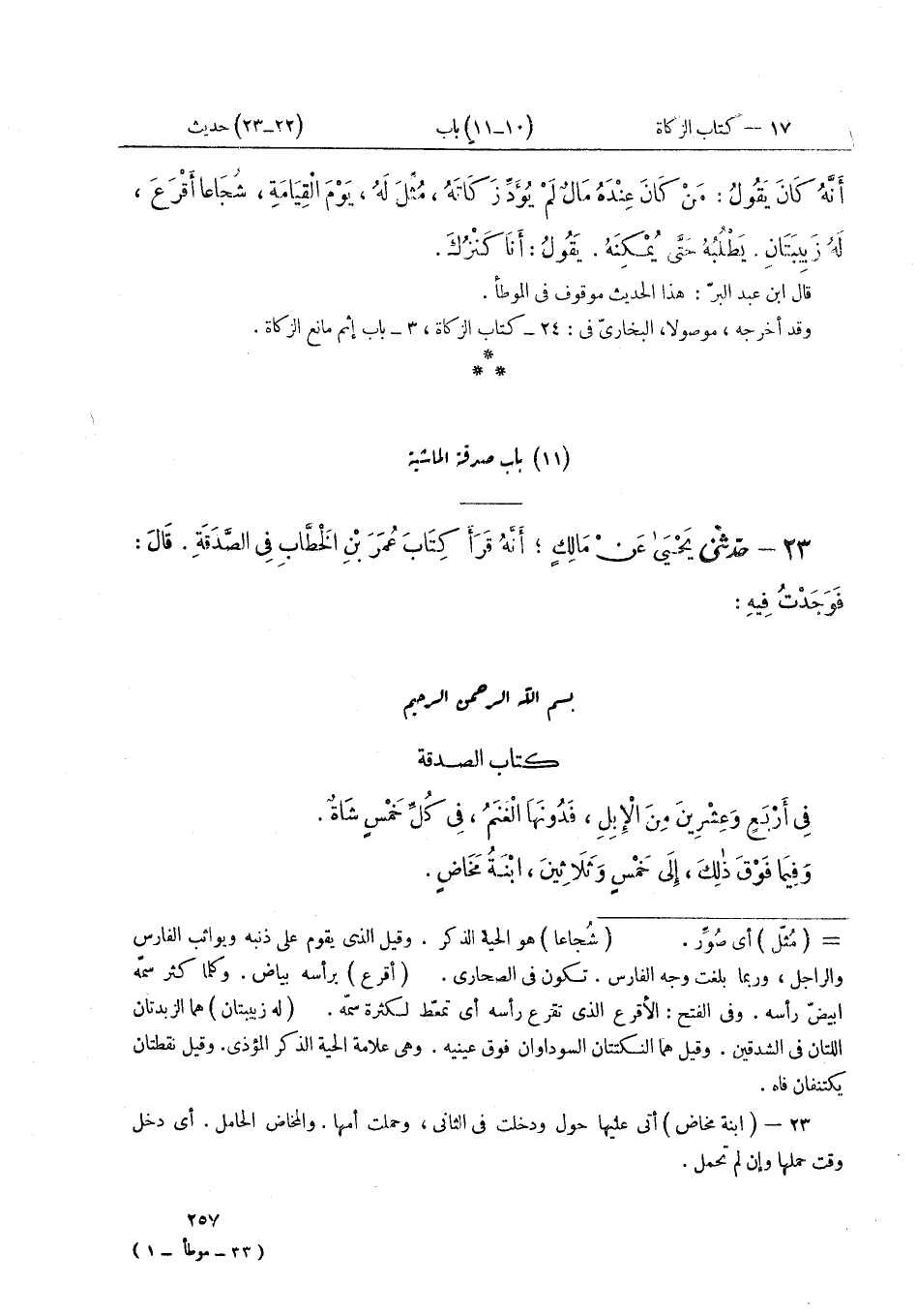 ٢٣ - حَدَّثَنِي يَحْيَى، عَنْ مَالِكٍ، أَنَّهُ قَرَأَ كِتَابَ عُمَرَ بْنِ الْخَطَّابِ فِي الصَّدَقَةِ، قَالَ: فَوَجَدْتُ فِيهِ: «بِسْمِ اللَّهِ الرَّحْمَنِ الرَّحِيمِ كِتَابُ الصَّدَقَةِ
