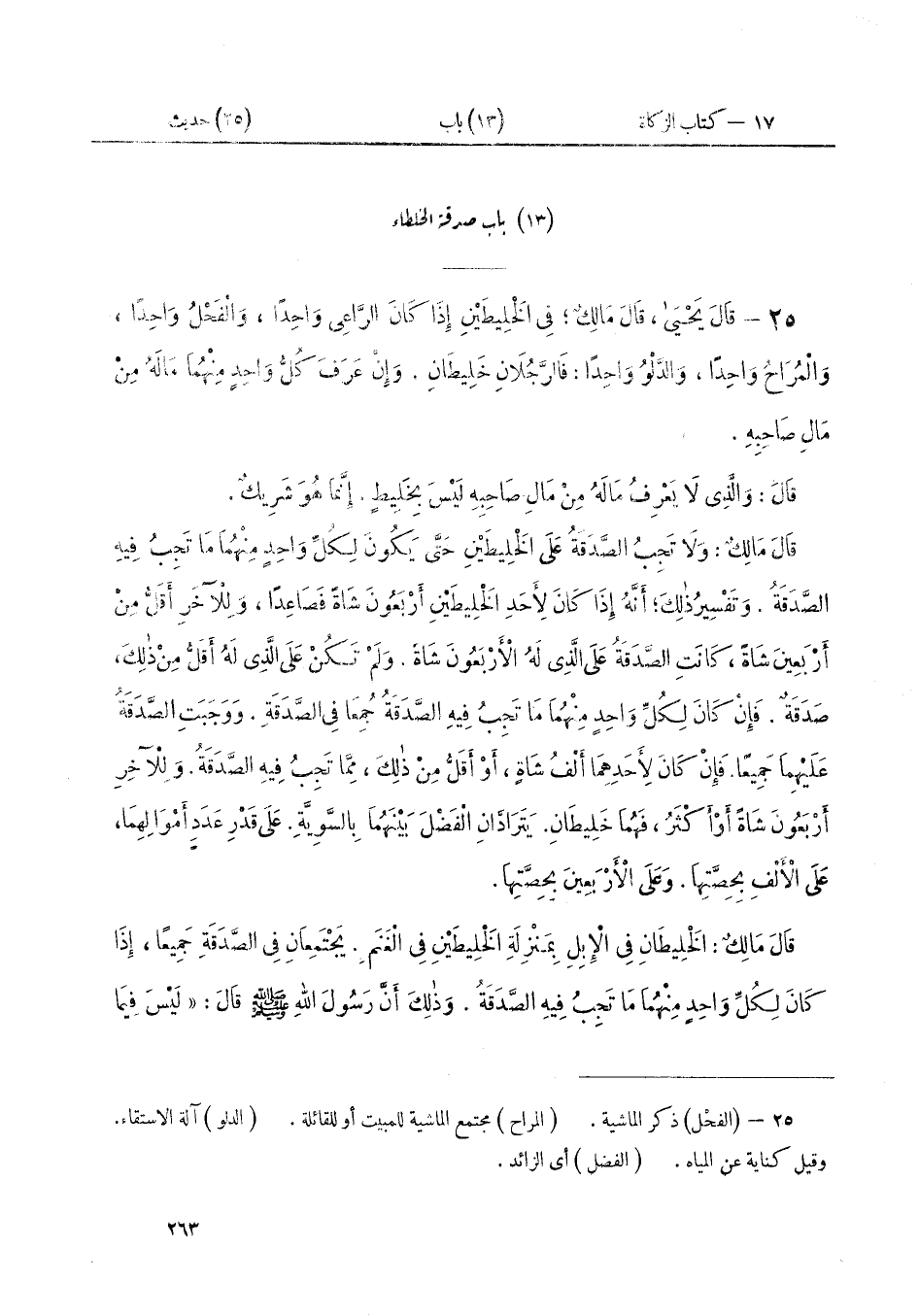 ٢٥ - قَالَ يَحْيَى: قَالَ مَالِكٌ: فِي الْخَلِيطَيْنِ إِذَا كَانَ الرَّاعِي وَاحِدًا، وَالْفَحْلُ وَاحِدًا، وَالْمُرَاحُ وَاحِدًا، وَالدَّلْوُ وَاحِدًا: " فَالرَّجُلَانِ خَلِيطَانِ. وَإِنْ عَرَفَ كُلُّ وَاحِدٍ مِنْهُمَا مَالَهُ مِنْ مَالِ صَاحِبِهِ. قَالَ: وَالَّذِي لَا يَعْرِفُ مَالَهُ مِنْ مَالِ صَاحِبِهِ لَيْسَ بِخَلِيطٍ. إِنَّمَا هُوَ شَرِيكٌ " قَالَ مَالِكٌ: «وَلَا تَجِبُ الصَّدَقَةُ عَلَى الْخَلِيطَيْنِ حَتَّى يَكُونَ لِكُلِّ وَاحِدٍ مِنْهُمَا مَا تَجِبُ فِيهِ الصَّدَقَةُ. وَتَفْسِيرُ ذَلِكَ، أَنَّهُ إِذَا كَانَ لِأَحَدِ الْخَلِيطَيْنِ أَرْبَعُونَ شَاةً فَصَاعِدًا، وَلِلْآخَرِ أَقَلُّ مِنْ أَرْبَعِينَ شَاةً، كَانَتِ الصَّدَقَةُ عَلَى الَّذِي لَهُ الْأَرْبَعُونَ شَاةً. وَلَمْ تَكُنْ عَلَى الَّذِي لَهُ أَقَلُّ مِنْ ذَلِكَ، صَدَقَةٌ. فَإِنْ كَانَ لِكُلِّ وَاحِدٍ مِنْهُمَا مَا تَجِبُ فِيهِ الصَّدَقَةُ جُمِعَا فِي الصَّدَقَةِ. وَوَجَبَتِ الصَّدَقَةُ عَلَيْهِمَا جَمِيعًا. فَإِنْ كَانَ لِأَحَدِهِمَا أَلْفُ شَاةٍ، أَوْ أَقَلُّ مِنْ ذَلِكَ، مِمَّا تَجِبُ فِيهِ الصَّدَقَةُ. وَلِلْآخَرِ أَرْبَعُونَ شَاةً أَوْ أَكْثَرُ، فَهُمَا خَلِيطَانِ يَتَرَادَّانِ الْفَضْلَ بَيْنَهُمَا بِالسَّوِيَّةِ. عَلَى قَدْرِ عَدَدِ أَمْوَالِهِمَا، عَلَى الْأَلْفِ بِحِصَّتِهَا، وَعَلَى الْأَرْبَعِينَ بِحِصَّتِهَا» قَالَ مَالِكٌ: " الْخَلِيطَانِ فِي الْإِبِلِ بِمَنْزِلَةِ الْخَلِيطَيْنِ فِي الْغَنَمِ. يَجْتَمِعَانِ فِي الصَّدَقَةِ جَمِيعًا، إِذَا كَانَ لِكُلِّ وَاحِدٍ مِنْهُمَا مَا تَجِبُ فِيهِ الصَّدَقَةُ. وَذَلِكَ أَنَّ رَسُولَ اللَّهِ صَلَّى اللهُ عَلَيْهِ وَسَلَّمَ قَالَ: لَيْسَ فِيمَا