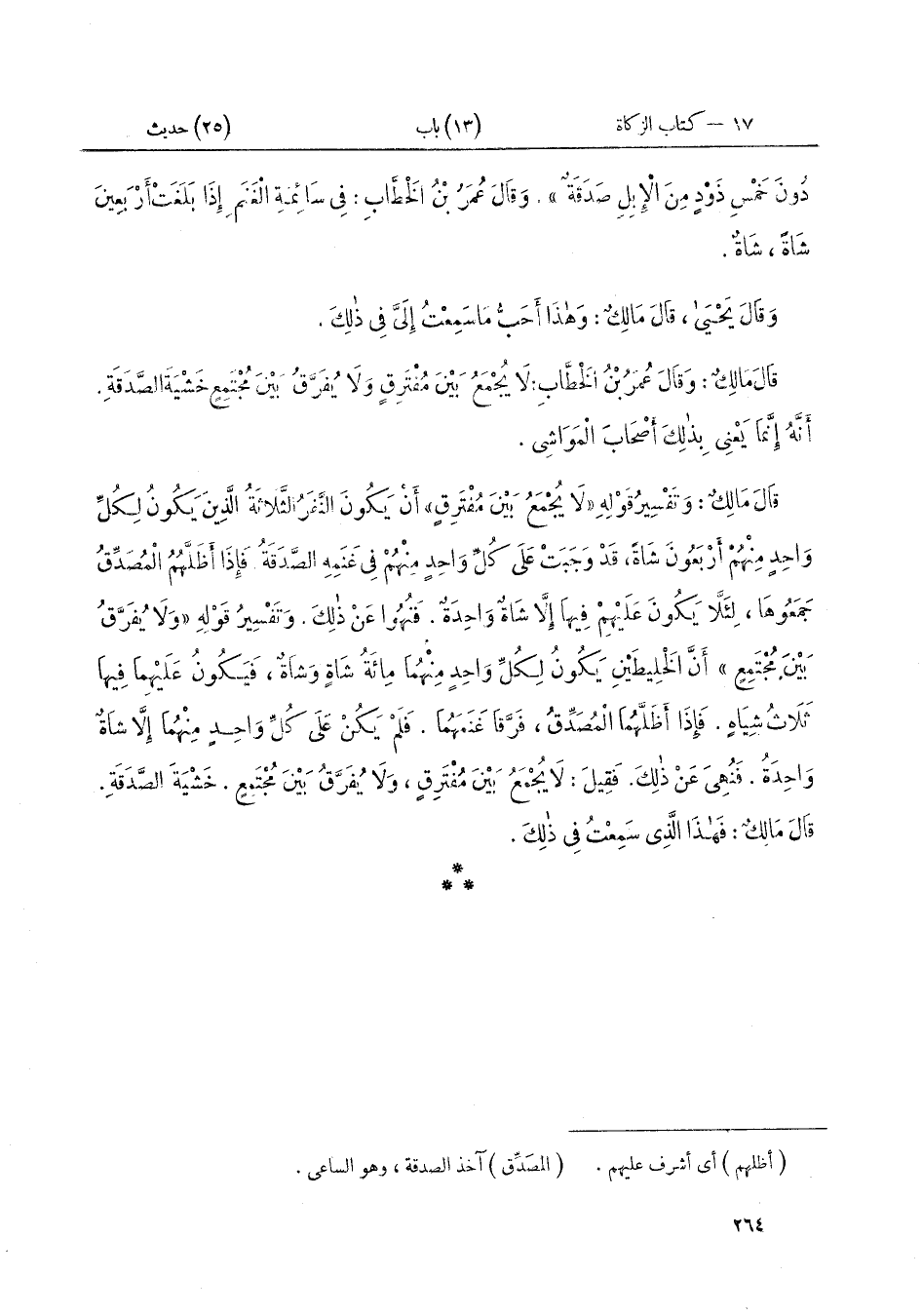 دُونَ خَمْسِ ذَوْدٍ مِنَ الْإِبِلِ صَدَقَةٌ، وقَالَ عُمَرُ بْنُ الْخَطَّابِ: فِي سَائِمَةِ الْغَنَمِ إِذَا بَلَغَتْ أَرْبَعِينَ شَاةً، شَاةٌ "، وقَالَ يَحْيَى: قَالَ مَالِكٌ: «وَهَذَا أَحَبُّ مَا سَمِعْتُ إِلَيَّ فِي ذَلِكَ» قَالَ مَالِكٌ: وقَالَ عُمَرُ بْنُ الْخَطَّابِ: " لَا يُجْمَعُ بَيْنَ مُفْتَرِقٍ، وَلَا يُفَرَّقُ بَيْنَ مُجْتَمِعٍ خَشْيَةَ الصَّدَقَةِ. أَنَّهُ إِنَّمَا يَعْنِي بِذَلِكَ أَصْحَابَ الْمَوَاشِي، قَالَ مَالِكٌ: وَتَفْسِيرُ قَوْلِهِ: لَا يُجْمَعُ بَيْنَ مُفْتَرِقٍ: أَنْ يَكُونَ النَّفَرُ الثَّلَاثَةُ الَّذِينَ يَكُونُ لِكُلِّ وَاحِدٍ مِنْهُمْ أَرْبَعُونَ شَاةً، قَدْ وَجَبَتْ عَلَى كُلِّ وَاحِدٍ مِنْهُمْ فِي غَنَمِهِ الصَّدَقَةُ، فَإِذَا أَظَلَّهُمُ الْمُصَدِّقُ جَمَعُوهَا، لِئَلَّا يَكُونَ عَلَيْهِمْ فِيهَا إِلَّا شَاةٌ وَاحِدَةٌ. فَنُهُوا عَنْ ذَلِكَ. وَتَفْسِيرُ قَوْلِهِ: وَلَا يُفَرَّقُ بَيْنَ مُجْتَمِعٍ أَنَّ الْخَلِيطَيْنِ يَكُونُ لِكُلِّ وَاحِدٍ مِنْهُمَا مِائَةُ شَاةٍ وَشَاةٌ، فَيَكُونُ عَلَيْهِمَا فِيهَا ثَلَاثُ شِيَاهٍ. فَإِذَا أَظَلَّهُمَا الْمُصَدِّقُ، فَرَّقَا غَنَمَهُمَا، فَلَمْ يَكُنْ عَلَى كُلِّ وَاحِدٍ مِنْهُمَا إِلَّا شَاةٌ وَاحِدَةٌ. فَنُهِيَ عَنْ ذَلِكَ. فَقِيلَ: لَا يُجْمَعُ بَيْنَ مُفْتَرِقٍ، وَلَا يُفَرَّقُ بَيْنَ مُجْتَمِعٍ. خَشْيَةَ الصَّدَقَةِ ". قَالَ مَالِكٌ: «فَهَذَا الَّذِي سَمِعْتُ فِي ذَلِكَ»