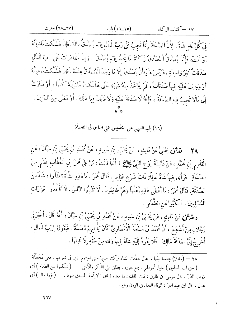 ٢٨ - حَدَّثَنِي يحْيَى عَنْ مَالِكٍ، عَنْ يَحْيَى بْنِ سَعِيدٍ، عَنْ مُحَمَّدِ بْنِ يَحْيَى بْنِ حَبَّانَ، عَنِ الْقَاسِمِ بْنِ مُحَمَّدٍ، عَنْ عَائِشَةَ زَوْجِ النَّبِيِّ صَلَّى اللهُ عَلَيْهِ وَسَلَّمَ، أَنَّهَا قَالَتْ: مُرَّ عَلَى عُمَرَ بْنِ الْخَطَّابِ بِغَنَمٍ مِنَ الصَّدَقَةِ. فَرَأَى فِيهَا شَاةً حَافِلًا ذَاتَ ضَرْعٍ عَظِيمٍ. فَقَالَ عُمَرُ: «مَا هَذِهِ الشَّاةُ؟» فَقَالُوا: شَاةٌ مِنَ الصَّدَقَةِ، فَقَالَ عُمَرُ: «مَا أَعْطَى هَذِهِ أَهْلُهَا وَهُمْ طَائِعُونَ، لَا تَفْتِنُوا النَّاسَ. لَا تَأْخُذُوا حَزَرَاتِ الْمُسْلِمِينَ نَكِّبُوا عَنِ الطَّعَامِ»