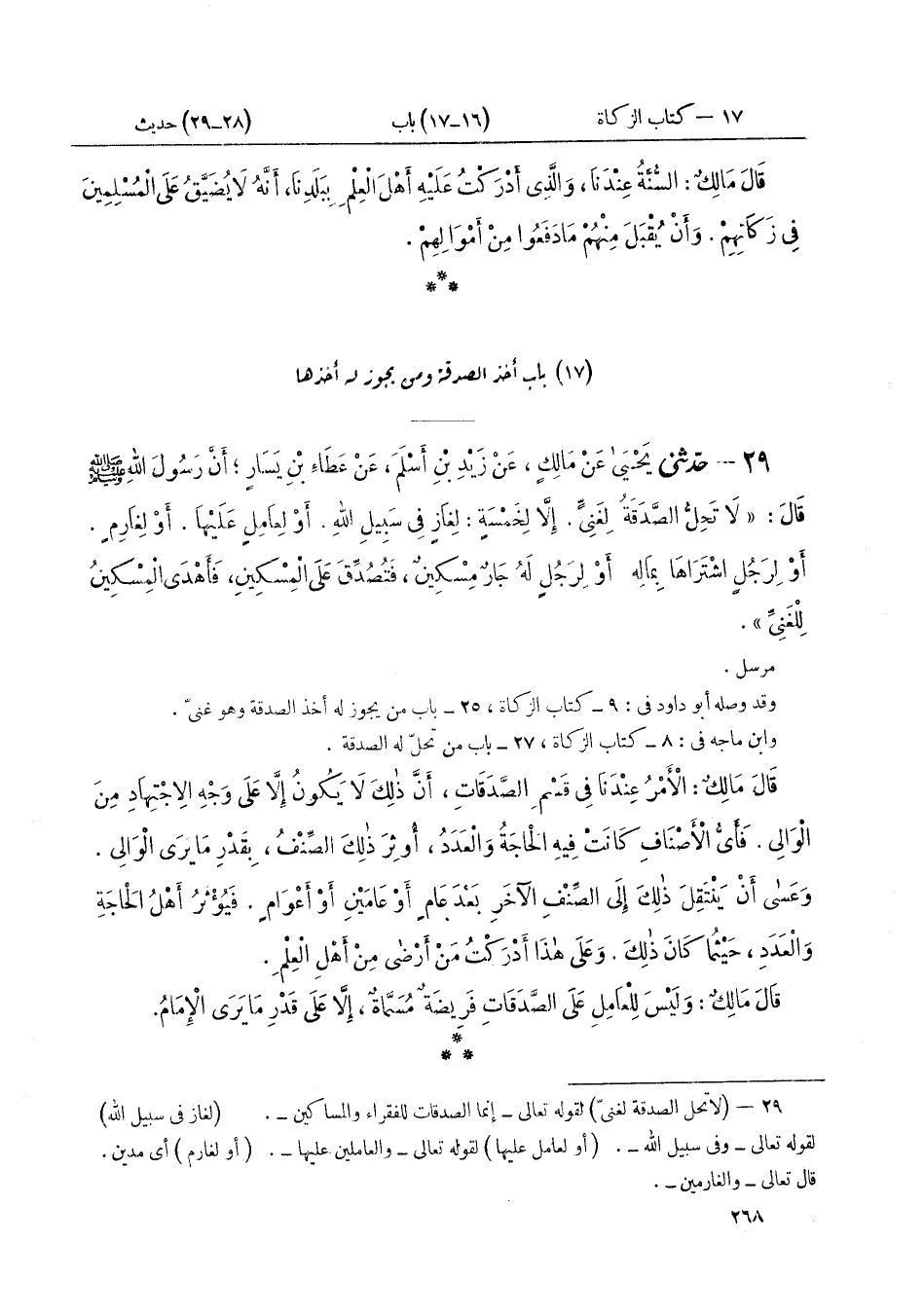 ٢٩ - حَدَّثَنِي يَحْيَى، عَنْ مَالِكٍ، عَنْ زَيْدِ بْنِ أَسْلَمَ، عَنْ عَطَاءِ بْنِ يَسَارٍ، أَنَّ رَسُولَ اللَّهِ صَلَّى اللهُ عَلَيْهِ وَسَلَّمَ قَالَ: " لَا تَحِلُّ الصَّدَقَةُ لِغَنِيٍّ إِلَّا لِخَمْسَةٍ: لِغَازٍ فِي سَبِيلِ اللَّهِ. أَوْ لِعَامِلٍ عَلَيْهَا. أَوْ لِغَارِمٍ. أَوْ لِرَجُلٍ اشْتَرَاهَا بِمَالِهِ. أَوْ لِرَجُلٍ لَهُ جَارٌ مِسْكِينٌ، فَتُصُدِّقَ عَلَى الْمِسْكِينِ، فَأَهْدَى الْمِسْكِينُ لِلْغَنِيِّ " قَالَ مَالِكٌ: «الْأَمْرُ عِنْدَنَا فِي قَسْمِ الصَّدَقَاتِ أَنَّ ذَلِكَ لَا يَكُونُ إِلَّا عَلَى وَجْهِ الِاجْتِهَادِ مِنَ الْوَالِي، فَأَيُّ الْأَصْنَافِ كَانَتْ فِيهِ الْحَاجَةُ وَالْعَدَدُ، أُوثِرَ ذَلِكَ الصِّنْفُ، بِقَدْرِ مَا يَرَى الْوَالِي. وَعَسَى أَنْ يَنْتَقِلَ ذَلِكَ إِلَى الصِّنْفِ الْآخَرِ بَعْدَ عَامٍ أَوْ عَامَيْنِ أَوْ أَعْوَامٍ. فَيُؤْثَرُ أَهْلُ الْحَاجَةِ وَالْعَدَدِ، حَيْثُمَا كَانَ ذَلِكَ. وَعَلَى هَذَا أَدْرَكْتُ مَنْ أَرْضَى مِنْ أَهْلِ الْعِلْمِ» قَالَ مَالِكٌ: «وَلَيْسَ لِلْعَامِلِ عَلَى الصَّدَقَاتِ فَرِيضَةٌ مُسَمَّاةٌ، إِلَّا عَلَى قَدْرِ مَا يَرَى الْإِمَامُ»