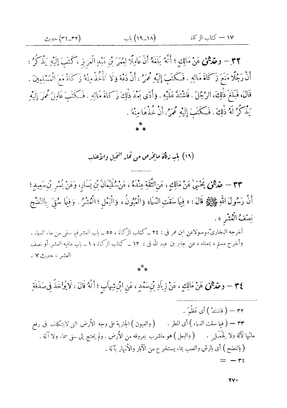٣٤ - وَحَدَّثَنِي عَنْ مَالِكٍ، عَنْ زِيَادِ بْنِ سَعْدٍ، عَنِ ابْنِ شِهَابٍ، أَنَّهُ قَالَ: «لَا يُؤْخَذُ فِي صَدَقَةِ ⦗٢٧١⦘ النَّخْلِ الْجُعْرُورُ وَلَا مُصْرَانُ الْفَارَةِ وَلَا عَذْقُ ابْنِ حُبَيْقٍ»، قَالَ: «وَهُوَ يُعَدُّ عَلَى صَاحِبِ الْمَالِ، وَلَا يُؤْخَذُ مِنْهُ فِي الصَّدَقَةِ» قَالَ مَالِكٌ: " وَإِنَّمَا مِثْلُ ذَلِكَ، الْغَنَمُ. تُعَدُّ عَلَى صَاحِبِهَا بِسِخَالِهَا. وَالسَّخْلُ لَا يُؤْخَذُ مِنْهُ فِي الصَّدَقَةِ. وَقَدْ يَكُونُ فِي الْأَمْوَالِ ثِمَارٌ لَا تُؤْخَذُ الصَّدَقَةُ مِنْهَا. مِنْ ذَلِكَ الْبُرْدِيُّ وَمَا أَشْبَهَهُ. لَا يُؤْخَذُ مِنْ أَدْنَاهُ، كَمَا لَا يُؤْخَذُ مِنْ خِيَارِهِ، قَالَ: وَإِنَّمَا تُؤْخَذُ الصَّدَقَةُ مِنْ أَوْسَاطِ الْمَالِ " قَالَ مَالِكٌ: «الْأَمْرُ الْمُجْتَمَعُ عَلَيْهِ عِنْدَنَا أَنَّهُ لَا يُخْرَصُ مِنَ الثِّمَارِ إِلَّا النَّخِيلُ وَالْأَعْنَابُ. فَإِنَّ ذَلِكَ يُخْرَصُ حِينَ يَبْدُو صَلَاحُهُ، وَيَحِلُّ بَيْعُهُ. وَذَلِكَ أَنَّ ثَمَرَ النَّخِيلِ وَالْأَعْنَابِ يُؤْكَلُ رُطَبًا وَعِنَبًا. فَيُخْرَصُ عَلَى أَهْلِهِ لِلتَّوْسِعَةِ عَلَى النَّاسِ. وَلِئَلَّا يَكُونَ عَلَى أَحَدٍ فِي ذَلِكَ ضِيقٌ. فَيُخْرَصُ ذَلِكَ عَلَيْهِمْ. ثُمَّ يُخَلَّى بَيْنَهُمْ وَبَيْنَهُ يَأْكُلُونَهُ كَيْفَ شَاءُوا. ثُمَّ يُؤَدُّونَ مِنْهُ الزَّكَاةَ عَلَى مَا خُرِصَ عَلَيْهِمْ» قَالَ مَالِكٌ: «فَأَمَّا مَا لَا يُؤْكَلُ رَطْبًا، وَإِنَّمَا يُؤْكَلُ بَعْدَ حَصَادِهِ مِنَ الْحُبُوبِ كُلِّهَا، فَإِنَّهُ لَا يُخْرَصُ وَإِنَّمَا عَلَى أَهْلِهَا فِيهَا إِذَا حَصَدُوهَا وَدَقُّوهَا وَطَيَّبُوهَا. وَخَلُصَتْ حَبًّا، فَإِنَّمَا عَلَى أَهْلِهَا فِيهَا الْأَمَانَةُ. يُؤَدُّونَ زَكَاتَهَا. إِذَا بَلَغَ ذَلِكَ مَا تَجِبُ فِيهِ الزَّكَاةُ. وَهَذَا الْأَمْرُ الَّذِي لَا اخْتِلَافَ فِيهِ عِنْدَنَا» ⦗٢٧٢⦘ قَالَ مَالِكٌ: «الْأَمْرُ الْمُجْتَمَعُ عَلَيْهِ عِنْدَنَا أَنَّ النَّخْلَ يُخْرَصُ عَلَى أَهْلِهَا. وَثَمَرُهَا فِي رُءُوسِهَا. إِذَا طَابَ وَحَلَّ بَيْعُهُ، وَيُؤْخَذُ مِنْهُ صَدَقَتُهُ تَمْرًا عِنْدَ الْجِدَادِ. فَإِنْ أَصَابَتِ الثَّمَرَةَ جَائِحَةٌ، بَعْدَ أَنْ تُخْرَصَ عَلَى أَهْلِهَا، وَقَبْلَ أَنْ تُجَذَّ، فَأَحَاطَتِ الْجَائِحَةُ بِالثَّمَرِ كُلِّهِ، فَلَيْسَ عَلَيْهِمْ صَدَقَةٌ. فَإِنْ بَقِيَ مِنَ الثَّمَرِ شَيْءٌ، يَبْلُغُ خَمْسَةَ أَوْسُقٍ فَصَاعِدًا، بِصَاعِ النَّبِيِّ صَلَّى اللهُ عَلَيْهِ وَسَلَّمَ أُخِذَ مِنْهُمْ زَكَاتُهُ، وَلَيْسَ عَلَيْهِمْ فِيمَا أَصَابَتِ الْجَائِحَةُ زَكَاةٌ. وَكَذَلِكَ الْعَمَلُ فِي الْكَرْمِ أَيْضًا. وَإِذَا كَانَ لِرَجُلٍ قِطَعُ أَمْوَالٍ مُتَفَرِّقَةٌ، أَوِ اشْتِرَاكٌ فِي أَمْوَالٍ مُتَفَرِّقَةٍ، لَا يَبْلُغُ مَالُ كُلِّ شَرِيكٍ أَوْ قِطَعُهُ مَا تَجِبُ فِيهِ الزَّكَاةُ، وَكَانَتْ إِذَا جُمِعَ بَعْضُ ذَلِكَ إِلَى بَعْضٍ، يَبْلُغُ مَا تَجِبُ فِيهِ الزَّكَاةُ، فَإِنَّهُ يَجْمَعُهَا وَيُؤَدِّي زَكَاتَهَا»